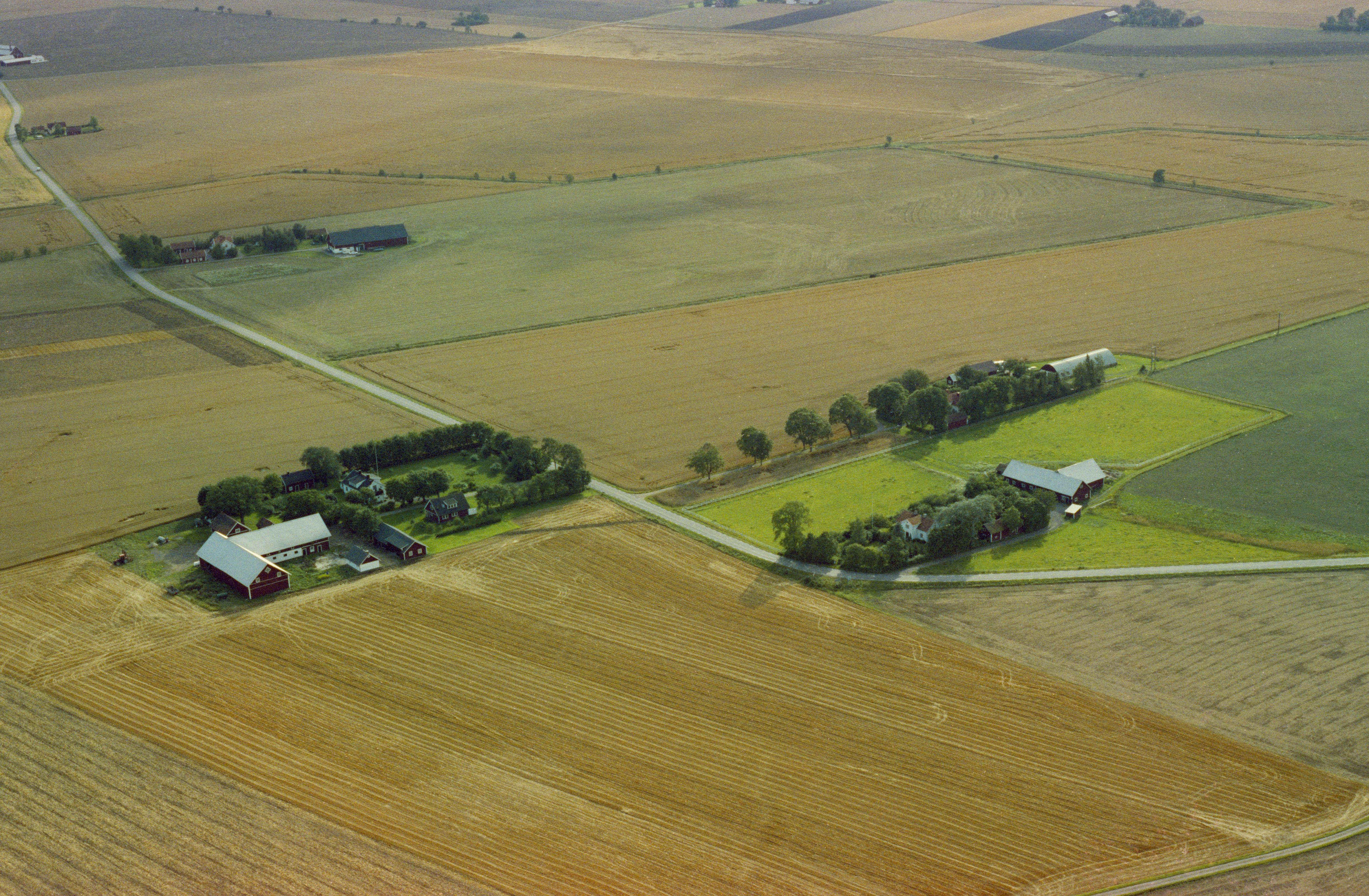 Beskrivning: Vid gränsen mellan socknen Väderstad och Hov. Mellangården och Krongården i bildens nedre del, Skattegården till vänster i bildens övre del. Bilden är tagen mot (väderstreck): VSV