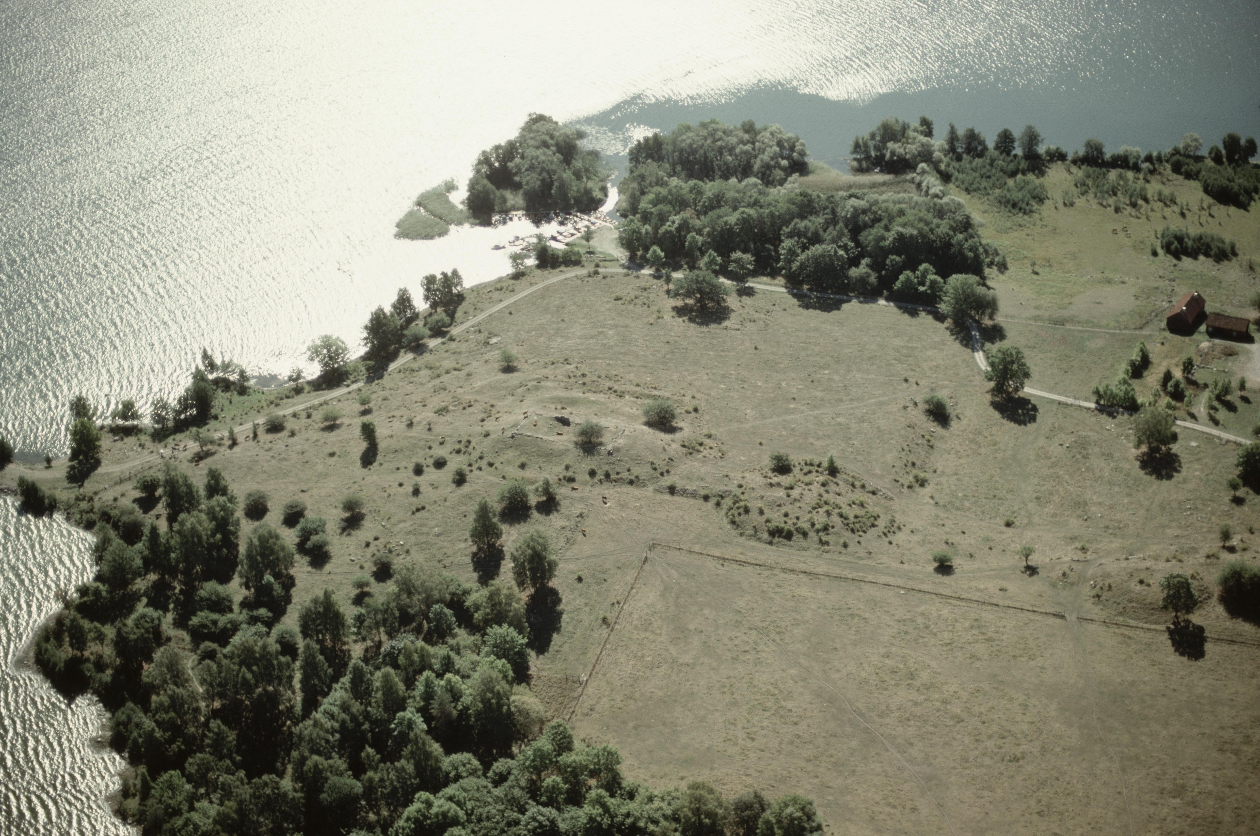 Beskrivning: Fornlämningsområdet Hovgården RAÄnr Adelsö 46:2 på Adelsön vid Hovgårdsfjärden i Mälaren. Alsnö hus RAÄnr Adelsö 47:1, stensättningar Adelsö 236 och 237, Kungshögarna Adelsö 48:1-6 m.fl. Bilden är tagen mot (väderstreck): S