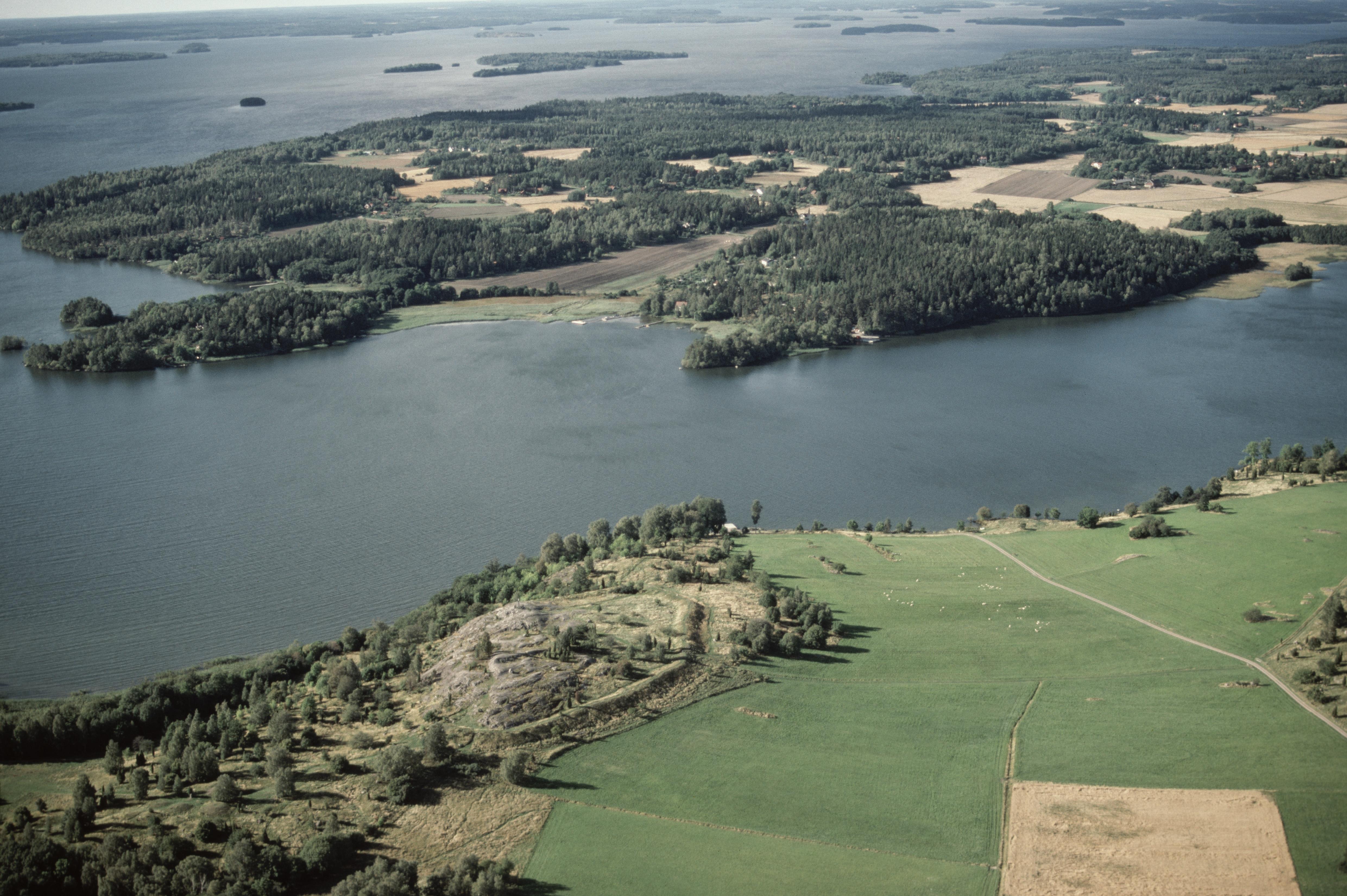 Beskrivning: Fornlämningsområdet Birka på Björkö i Mälaren. Norra delen av ön vid gravfält Borgs hage RAÄnr Adelsö 35:1, fornborg Borg Adelsö 34:1, bo- och gravplats Hemlanden och Svarta jorden Adelsö 118:1 vid Stadsvallen Adelsö 119:1-2. Adelsön i bildens övre del. Bilden är tagen mot (väderstreck): NV