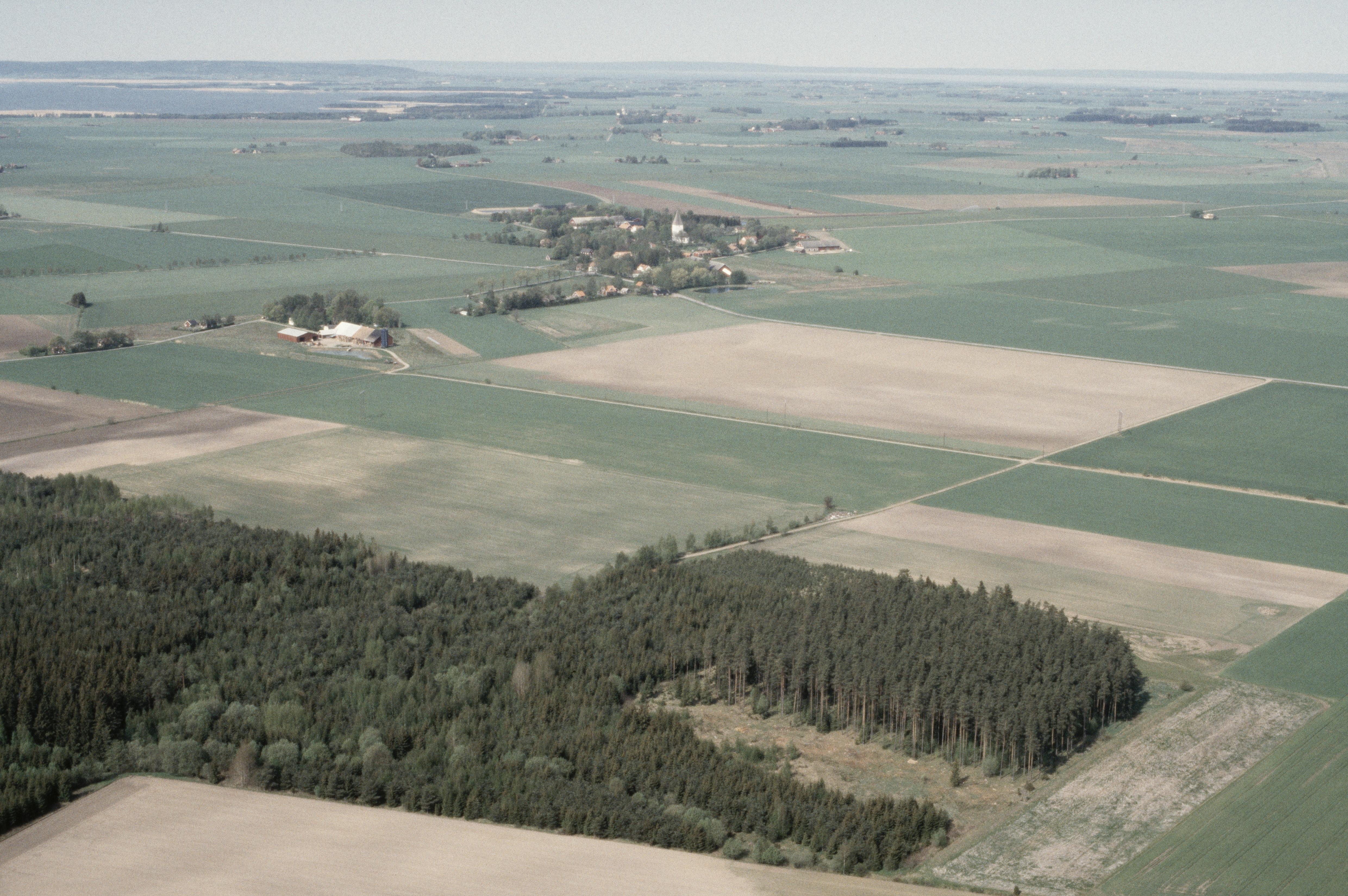 Beskrivning: Bjälbo kyrka och kyrkby i bildens övre del. Bilden är tagen mot (väderstreck): VNV