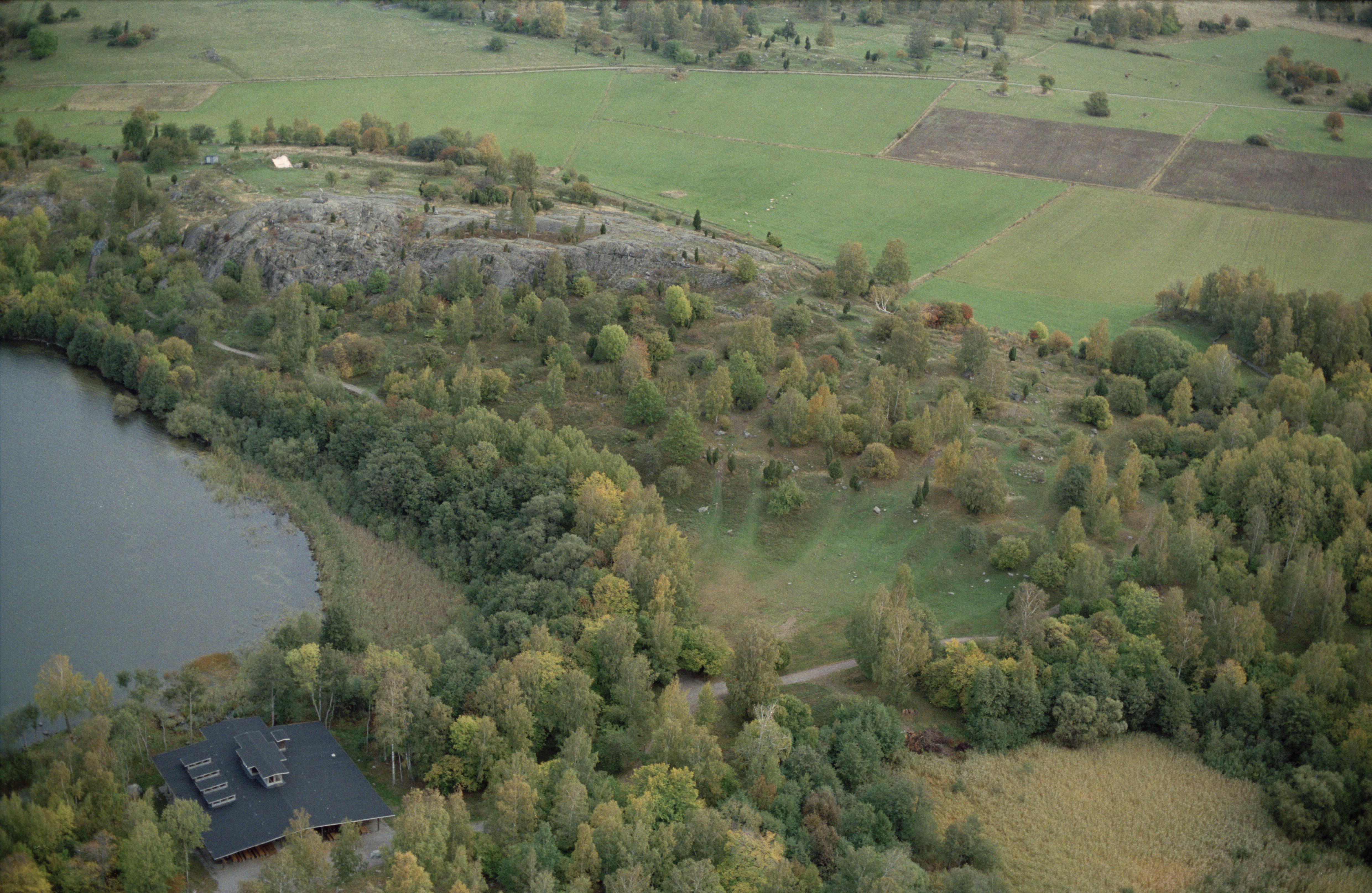 Beskrivning: Fornlämningsområdet Birka på Björkö i Mälaren. Norra delen av ön vid gravfält Borgs hage RAÄnr Adelsö 35:1 och fornborg Borg Adelsö 34:1 vid Ångholmen. I bildens övre del boplats Svarta jorden RAÄnr Adelsö 118:1. Bilden är tagen mot (väderstreck): NO