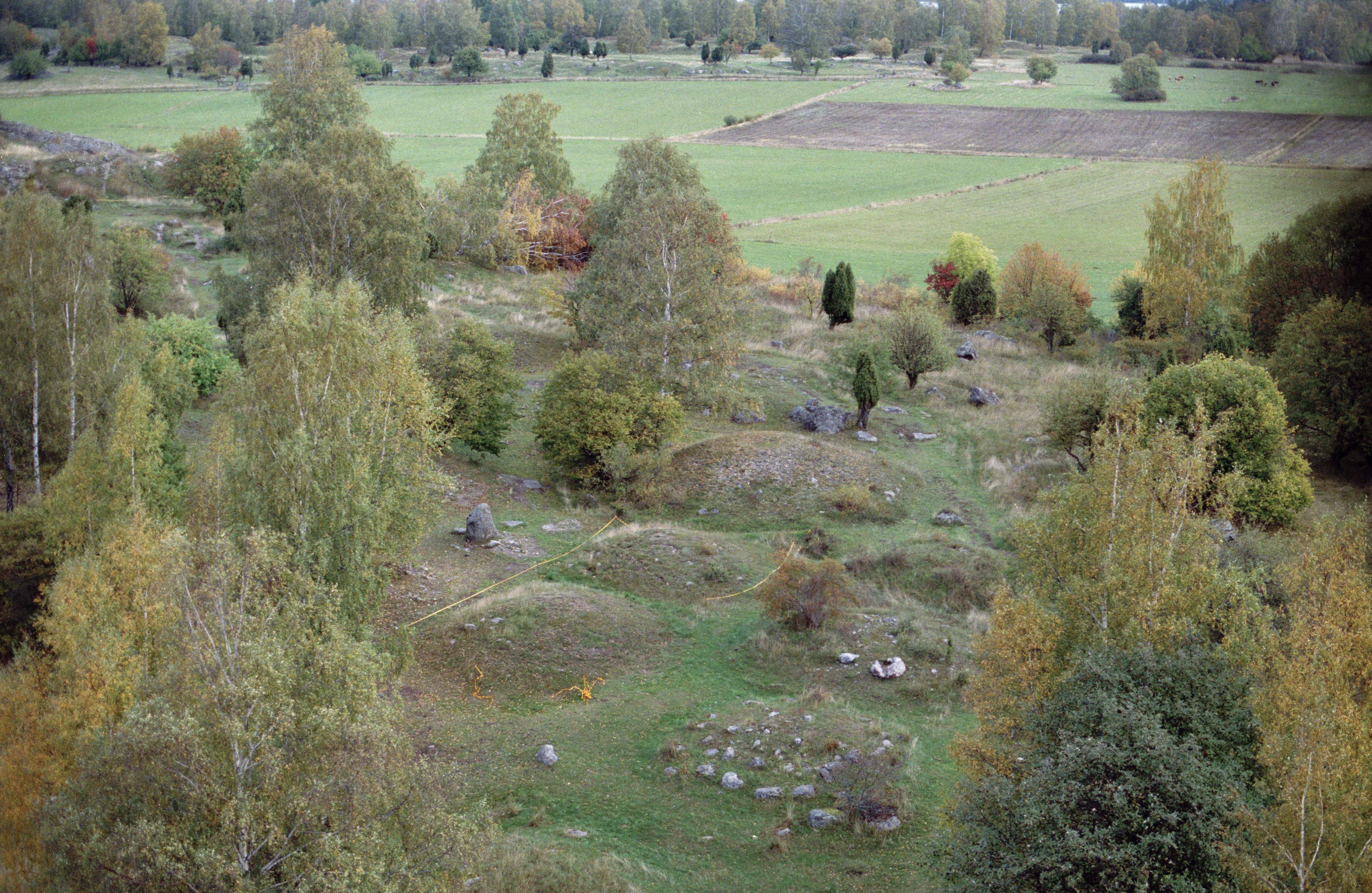 Beskrivning: Fornlämningsområdet Birka på Björkö i Mälaren. Stigar i gravfält Borgs hage RAÄnr Adelsö 35:1 vid fornborg Borg RAÄnr Adelsö 34:1. I bildens övre del bo- och gravplats Hemlanden och Svarta jorden RAÄnr Adelsö 118:1 vid Stadsvallen Adelsö 119:1-2. Bilden är tagen mot (väderstreck): N