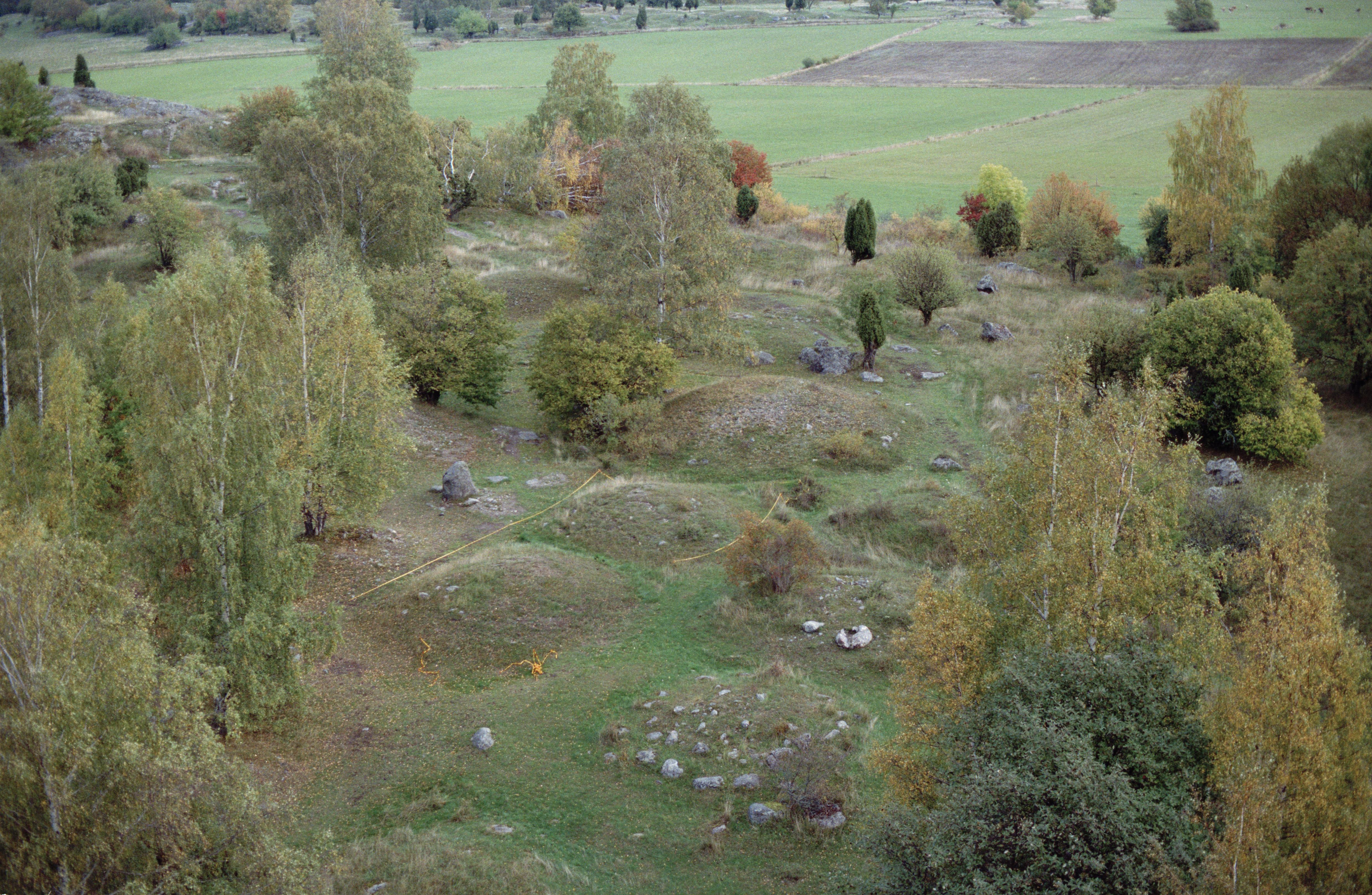Beskrivning: Fornlämningsområdet Birka på Björkö i Mälaren. Stigar i gravfält Borgs hage RAÄnr Adelsö 35:1 vid fornborg Borg RAÄnr Adelsö 34:1. I bildens övre del bo- och gravplats Hemlanden och Svarta jorden RAÄnr Adelsö 118:1 vid Stadsvallen Adelsö 119:1-2. Bilden är tagen mot (väderstreck): N