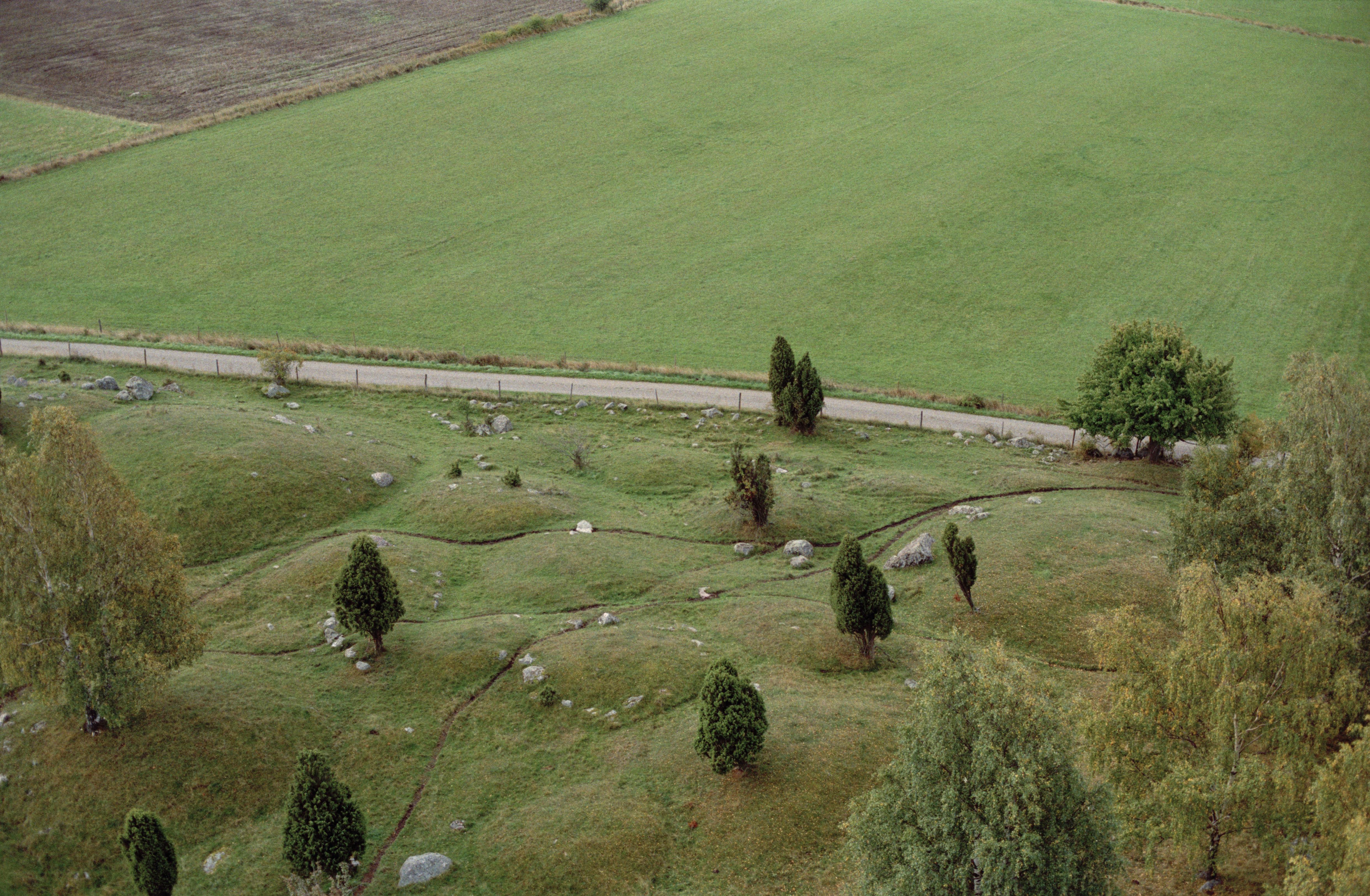 Beskrivning: Fornlämningsområdet Birka på Björkö i Mälaren. Södra delen av bo- och gravplats Hemlanden och Svarta jorden RAÄnr Adelsö 118:1 vid Stadsvallen Adelsö 119:1-2. Bilden är tagen mot (väderstreck): SSV