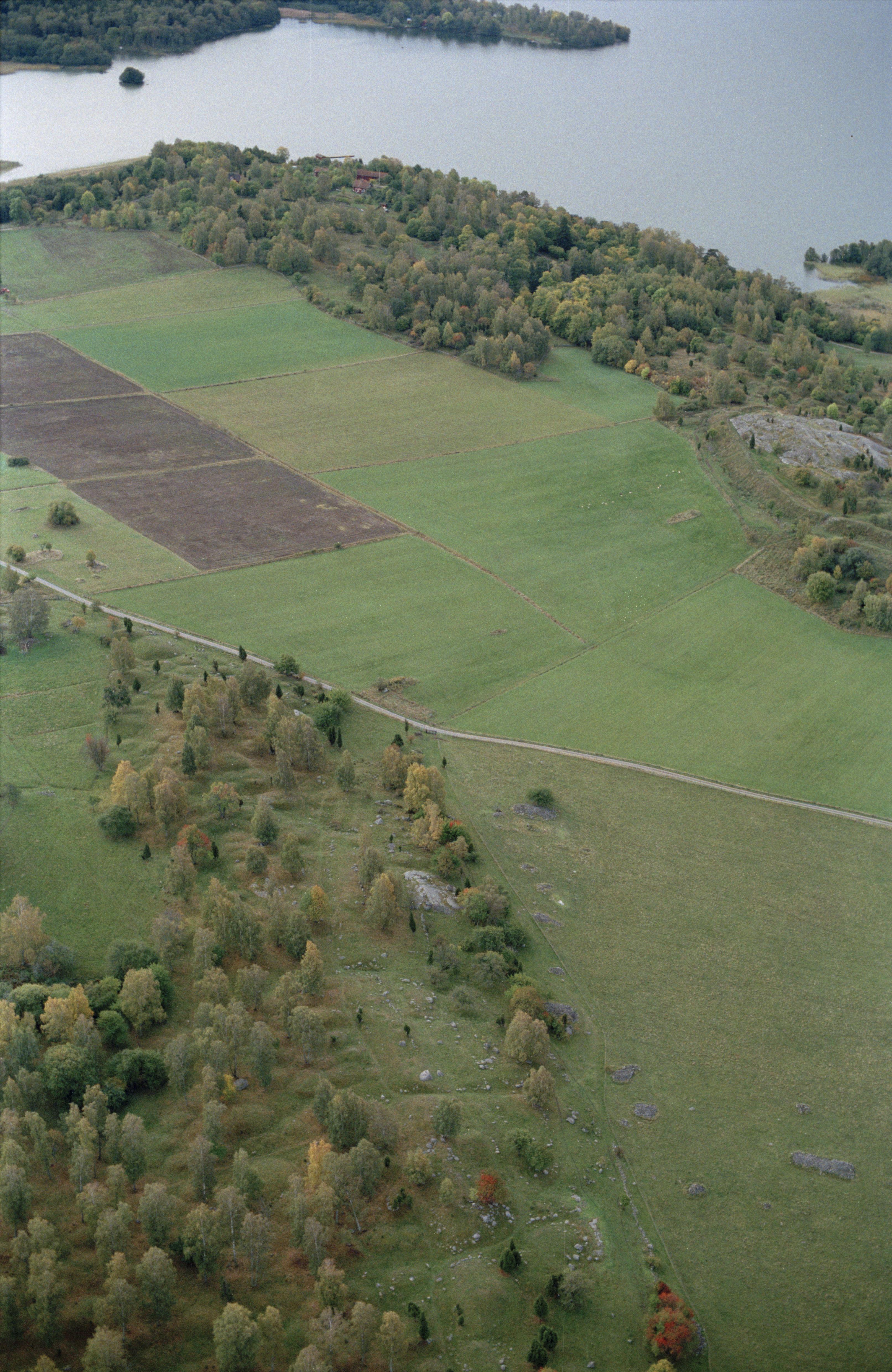 Beskrivning: Fornlämningsområdet Birka på Björkö i Mälaren. Norra delen av ön vid bo- och gravplats Hemlanden och Svarta jorden RAÄnr Adelsö 118:1 vid Stadsvallen Adelsö 119:1-2. Till höger om bildens mitt gravfält Borgs hage RAÄnr Adelsö 35:1 och fornborg Borg Adelsö 34:1 vid Ångholmen. Stadsvallen i bildens nedre del. Bilden är tagen mot (väderstreck): S