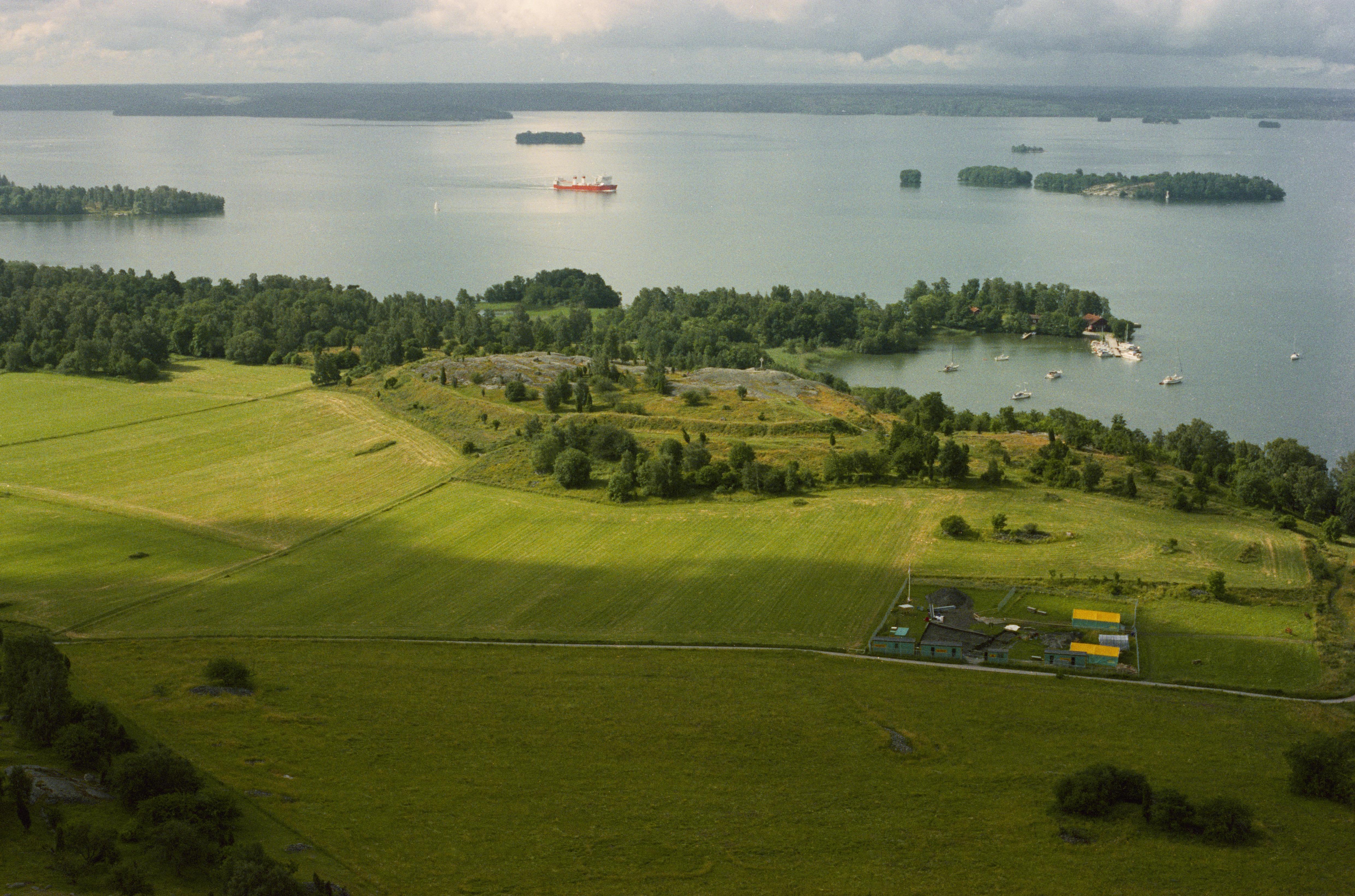 Beskrivning: Fornlämningsområdet Birka på Björkö i Mälaren. Vid bildens mitt fornborg Borg RAÄnr Adelsö 34:1 vid Ångholmen. Nere till höger arkeologisk undersökning i norra delen av ön i bo- och gravplats Hemlanden och Svarta jorden RAÄnr Adelsö 118:1 vid Stadsvallen Adelsö 119:1-2. Bilden är tagen mot (väderstreck): SSV