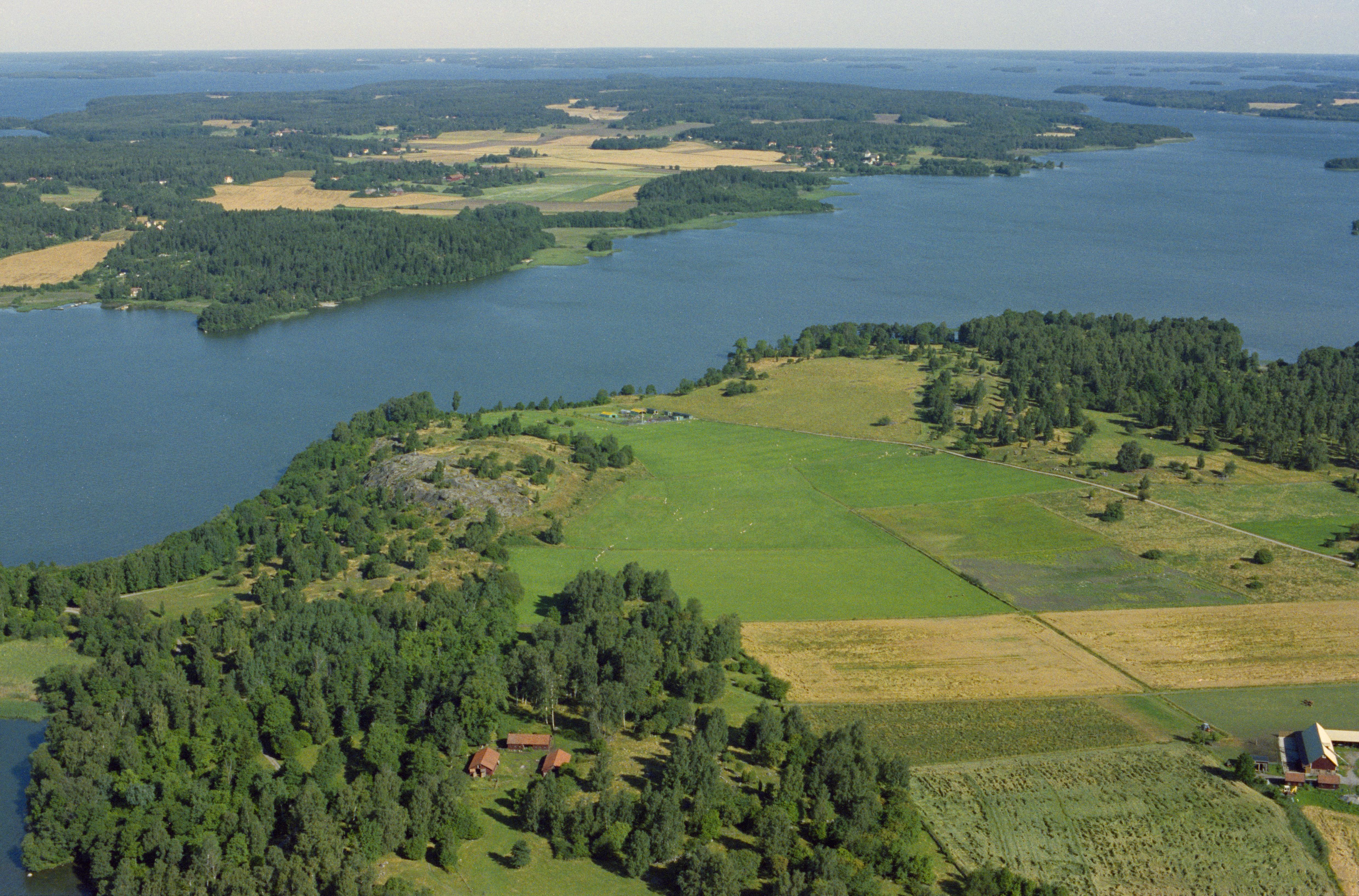 Beskrivning: Fornlämningsområdet Birka på Björkö i Mälaren. Vid bildens mitt fornborg Borg RAÄnr Adelsö 34:1 och arkeologisk undersökning i norra delen av ön i bo- och gravplats Hemlanden och Svarta jorden RAÄnr Adelsö 118:1 vid Stadsvallen Adelsö 119:1-2. Adelsön i bildens övre del. Bilden är tagen mot (väderstreck): NNV