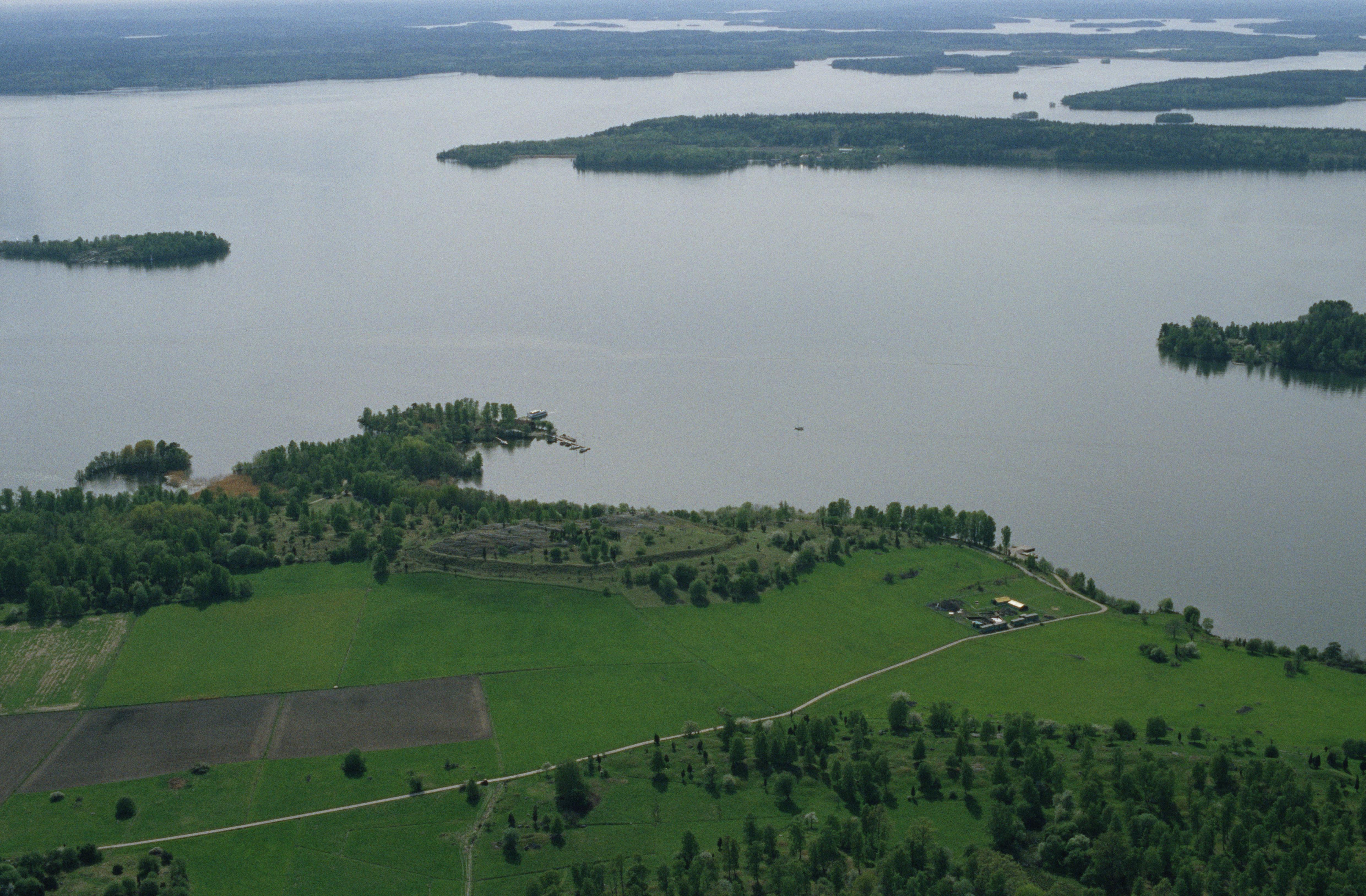 Beskrivning: Fornlämningsområdet Birka på Björkö i Mälaren. Till höger under bildens mitt arkeologisk undersökning i bo- och gravplats Hemlanden och Svarta jorden RAÄnr Adelsö 118:1 vid Stadsvallen Adelsö 119:1-2. Till vänster fornborg Borg Adelsö 34:1 vid Ångholmen. Bilden är tagen mot (väderstreck): VSV