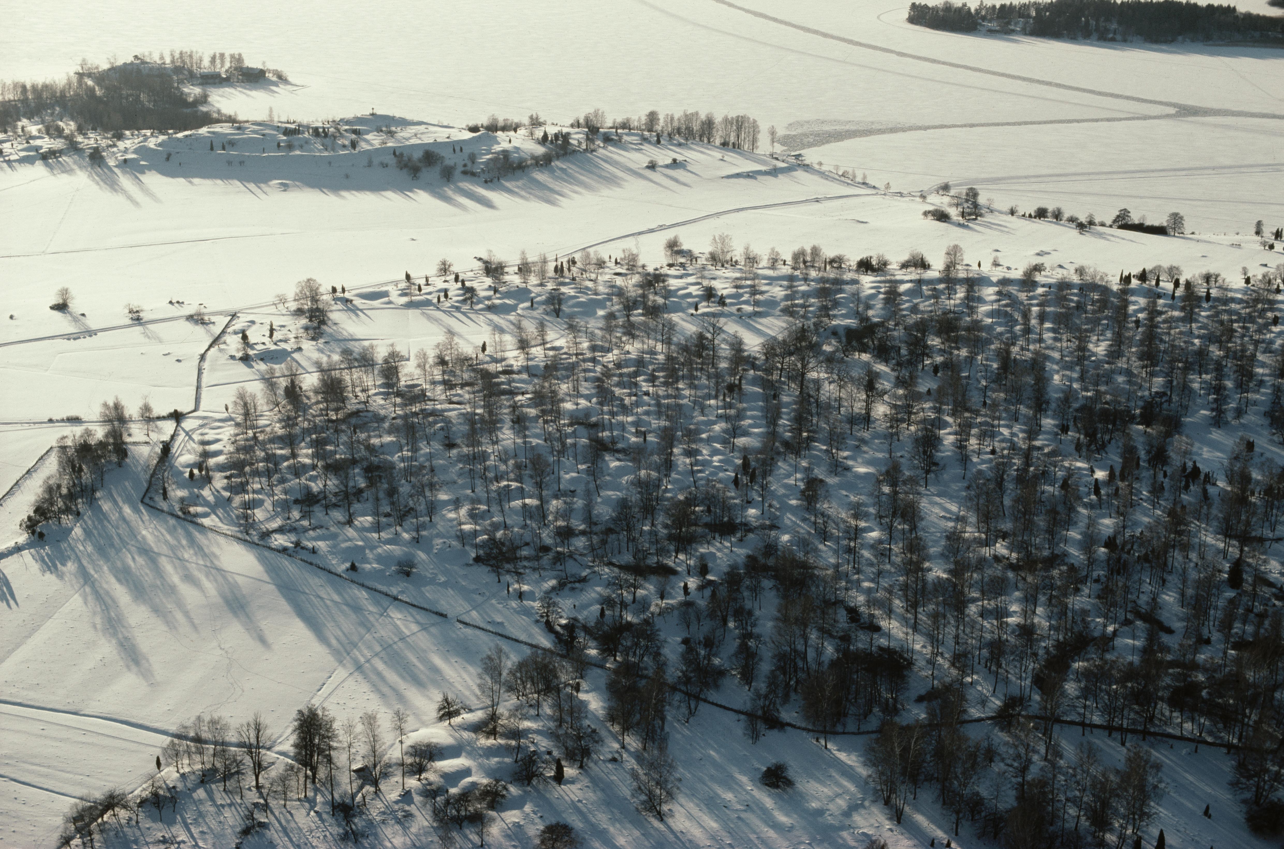 Beskrivning: Fornlämningsområdet Birka på Björkö i Mälaren. Norra delen av ön i området Hemlanden och Svarta jorden RAÄnr Adelsö 118:1 vid Stadsvallen Adelsö 119:1-2. Uppe till vänster gravfält Borgs hage RAÄnr Adelsö 35:1 och fornborg Borg Adelsö 34:1 vid Ångholmen. Bilden är tagen mot (väderstreck): SV