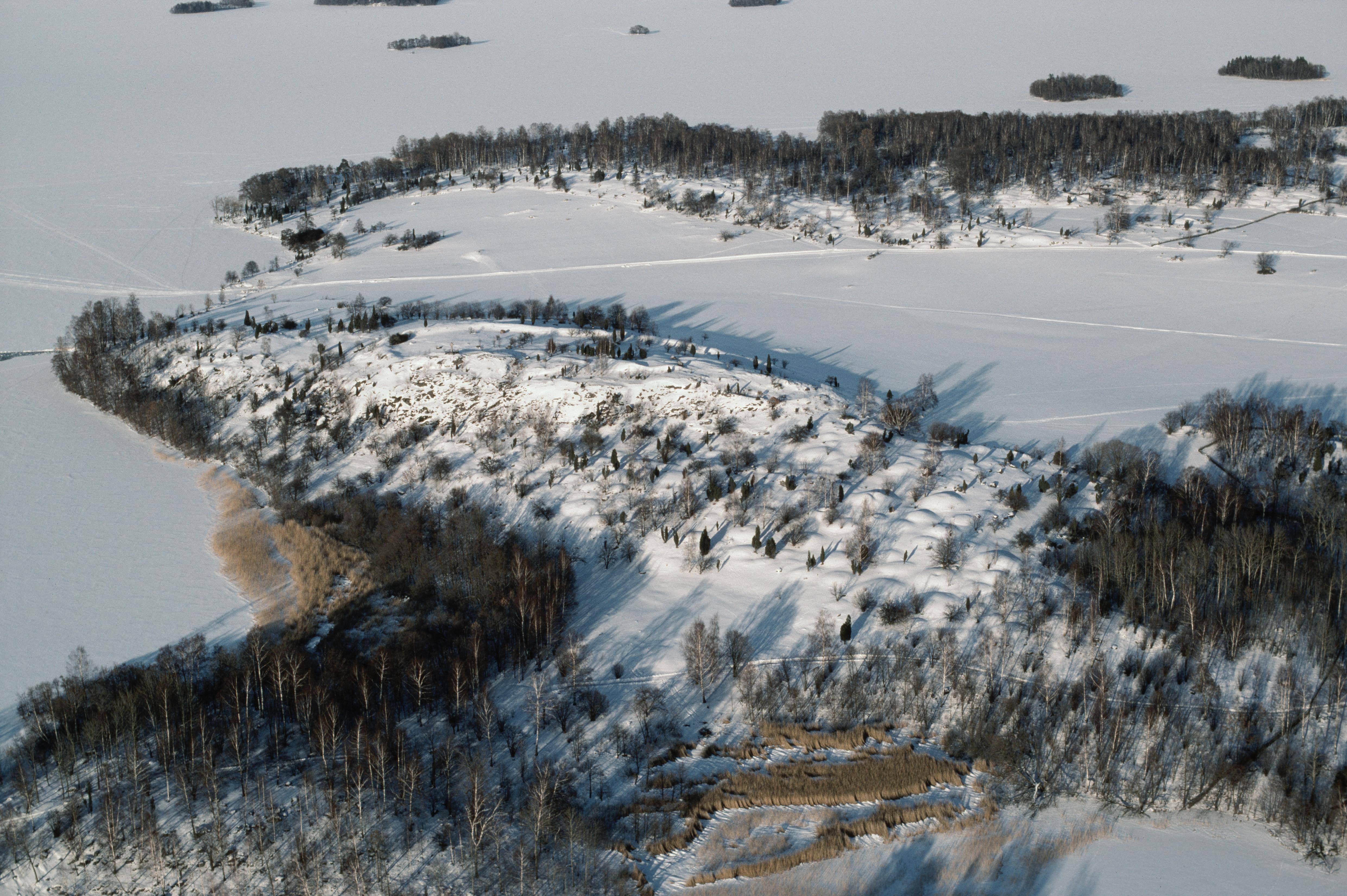 Beskrivning: Fornlämningsområdet Birka på Björkö i Mälaren. Gravfält Borgs hage RAÄnr Adelsö 35:1 och fornborg Borg Adelsö 34:1. I bildens övre del bo- och gravplats Hemlanden och Svarta jorden RAÄnr Adelsö 118:1 vid Stadsvallen Adelsö 119:1-2. Bilden är tagen mot (väderstreck): NO