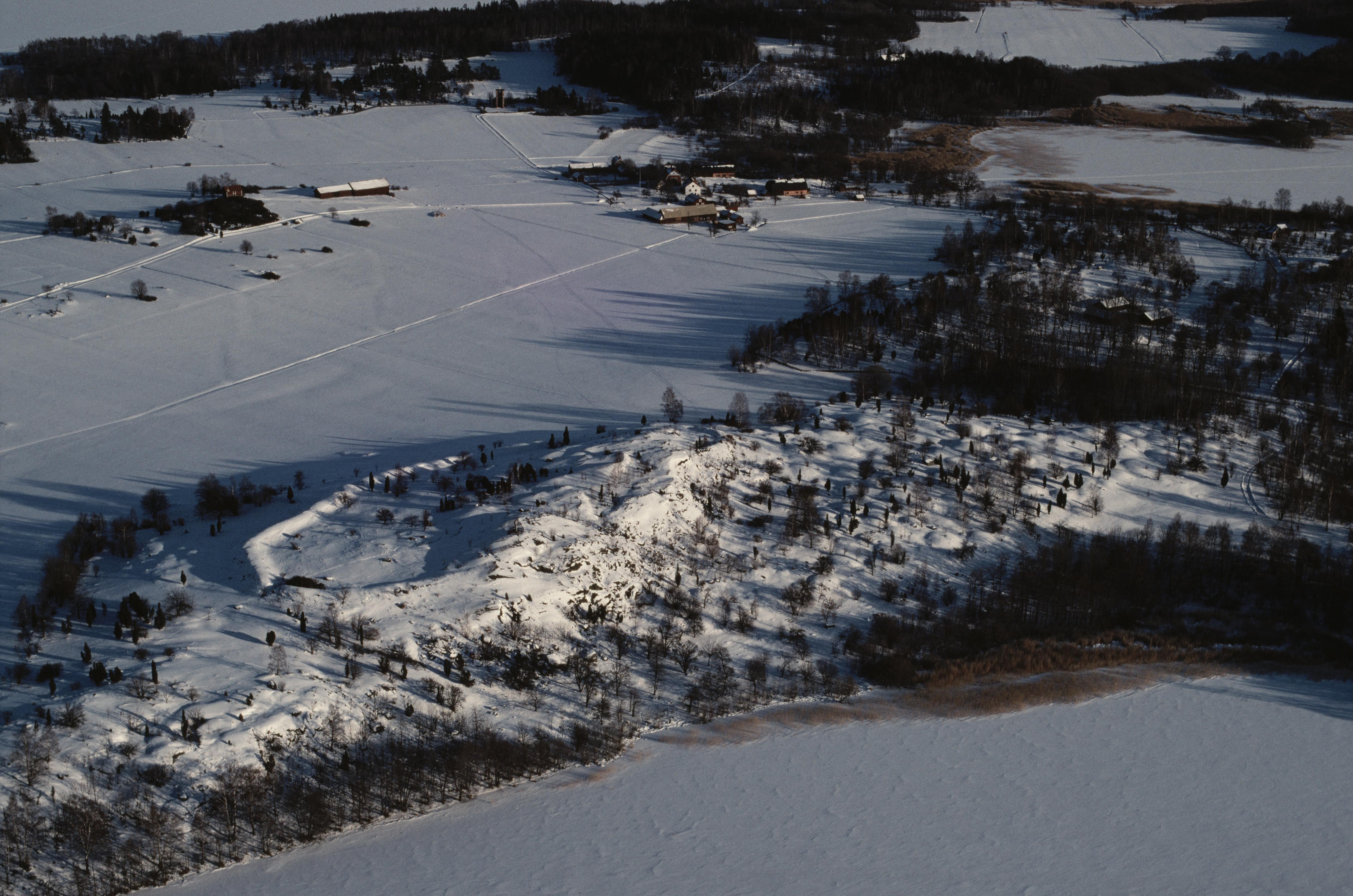 Beskrivning: Fornlämningsområdet Birka på Björkö i Mälaren. Fornborg Borg RAÄnr Adelsö 34:1, gravfält Borgs hage Adelsö 35:1 m.fl. I bildens övre del Grindsbacka, Björkö kapell (Angarskapellet) och Björkö by. Bilden är tagen mot (väderstreck): Ö