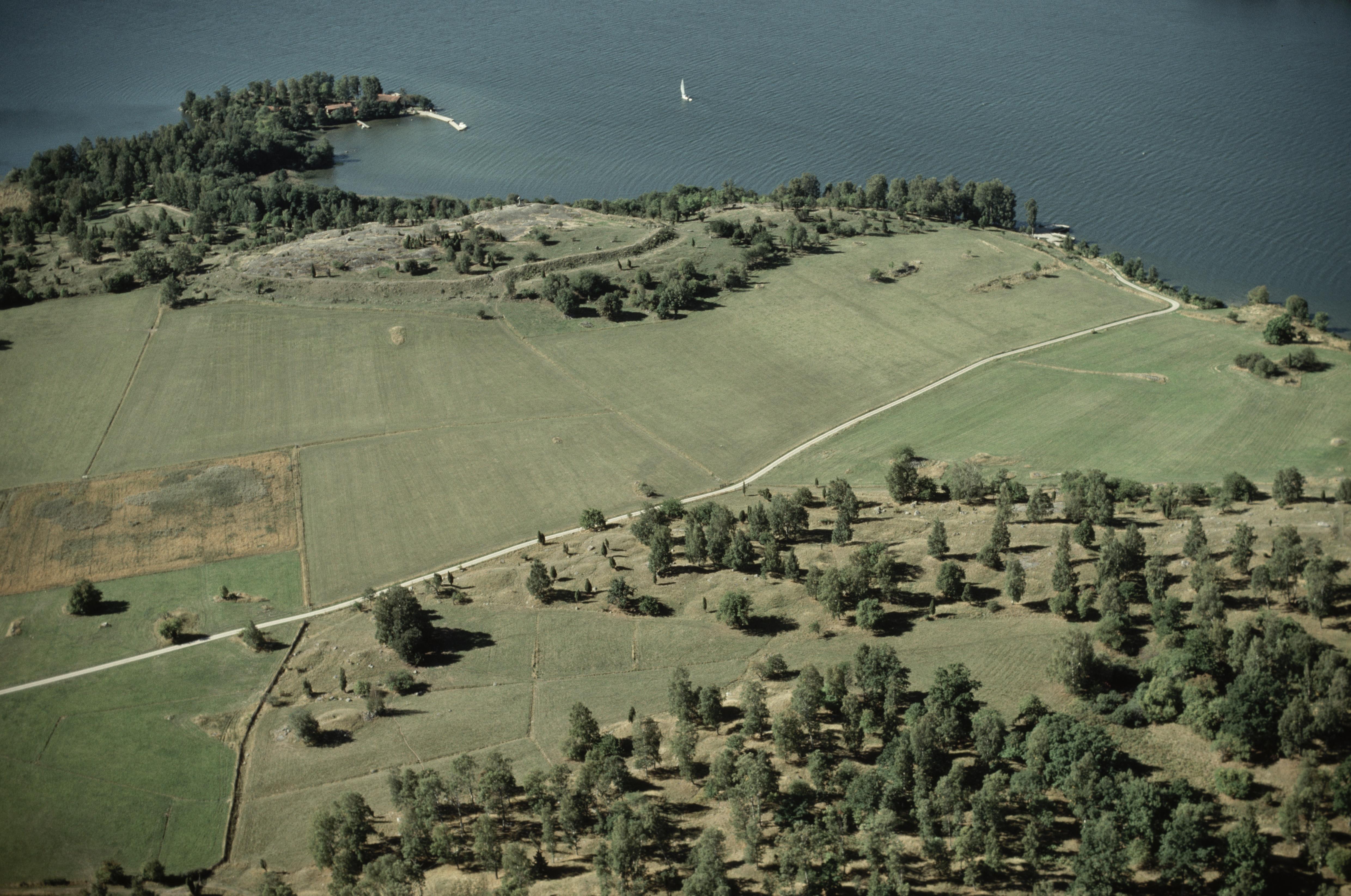 Beskrivning: Fornlämningsområdet Birka på Björkö i Mälaren. Norra delen av ön vid bo- och gravplats Hemlanden och Svarta jorden RAÄnr Adelsö 118:1 vid Stadsvallen Adelsö 119:1-2. I bildens övre del gravfält Borgs hage RAÄnr Adelsö 35:1 och fornborg Borg Adelsö 34:1 vid Ångholmen. Bilden är tagen mot (väderstreck): VSV
