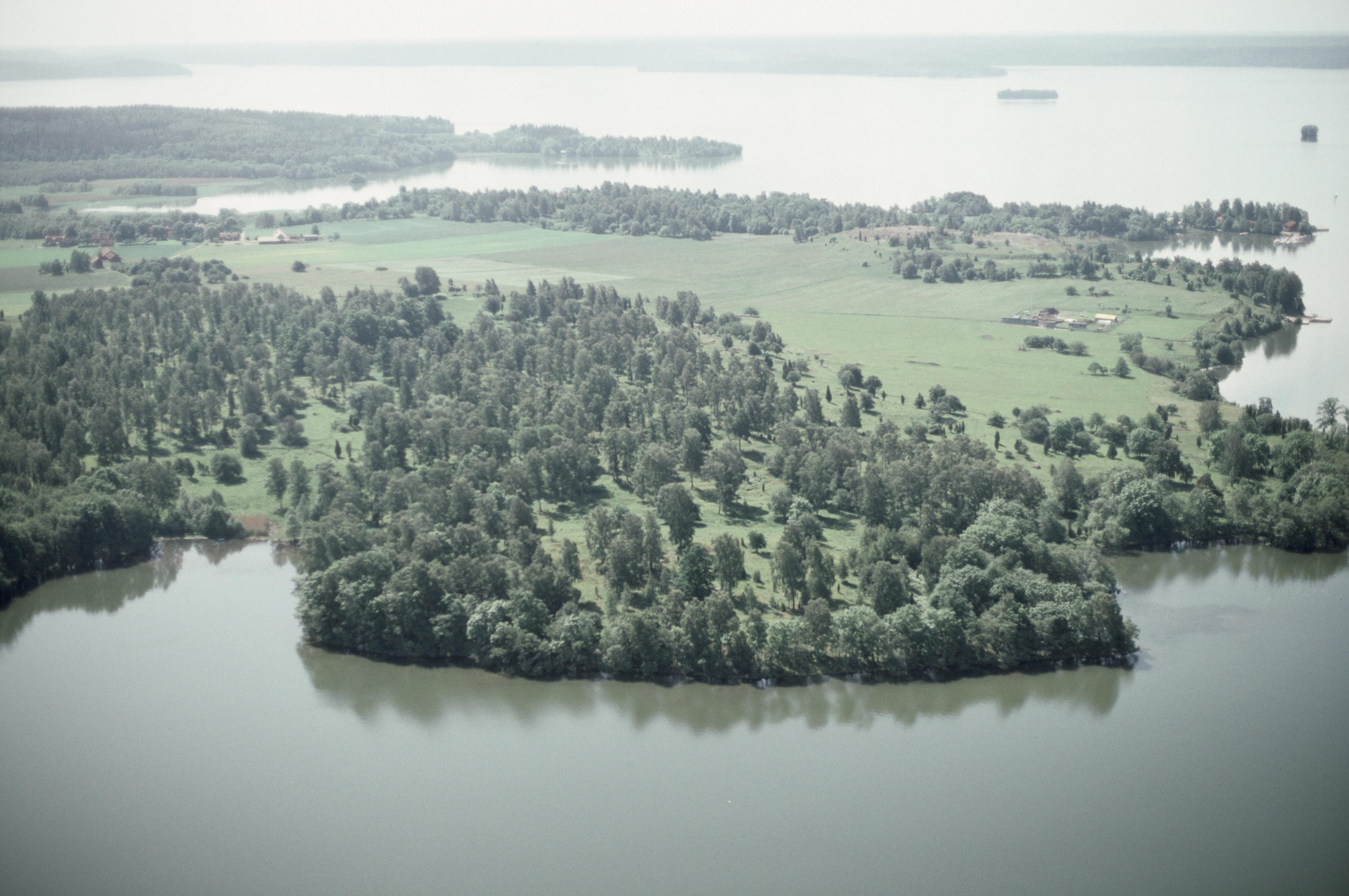 Beskrivning: Fornlämningsområdet Birka på Björkö i Mälaren vid Korshamn och Kugghamn. Till höger om bildens mitt arkeologisk undersökning i bo- och gravplats Hemlanden och Svarta jorden RAÄnr Adelsö 118:1 vid Stadsvallen Adelsö 119:1-2 och fornborg Borg Adelsö 34:1 vid Ångholmen. Bilden är tagen mot (väderstreck): S