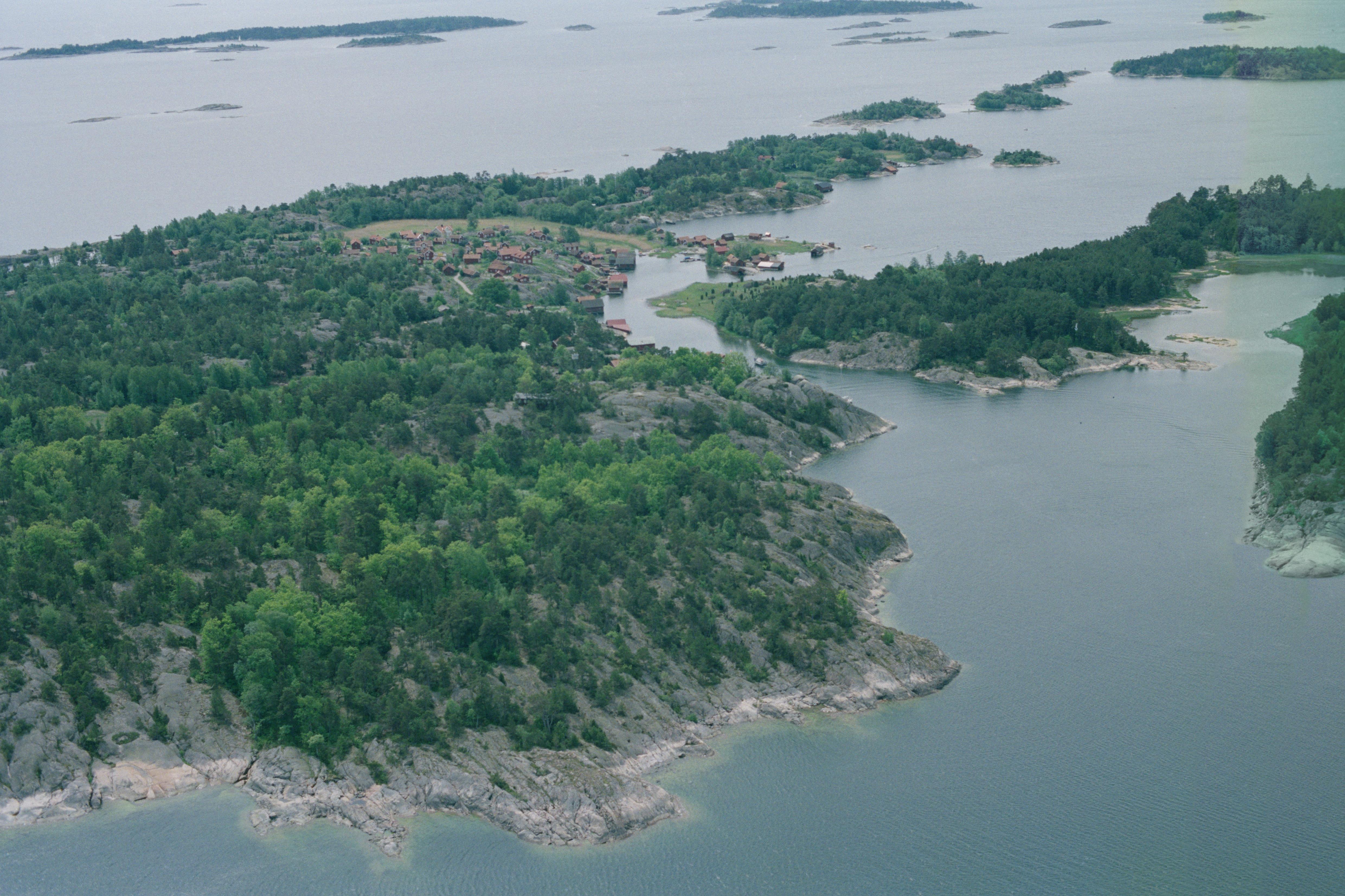 Beskrivning: Gryts skärgård. Ön Harstena, sydvästra delen. Harstena fiskeläge och lotshamn. Ett träd (ek) RAÄnr Gryt 101:1 i byn. Bilden är tagen mot (väderstreck): SO