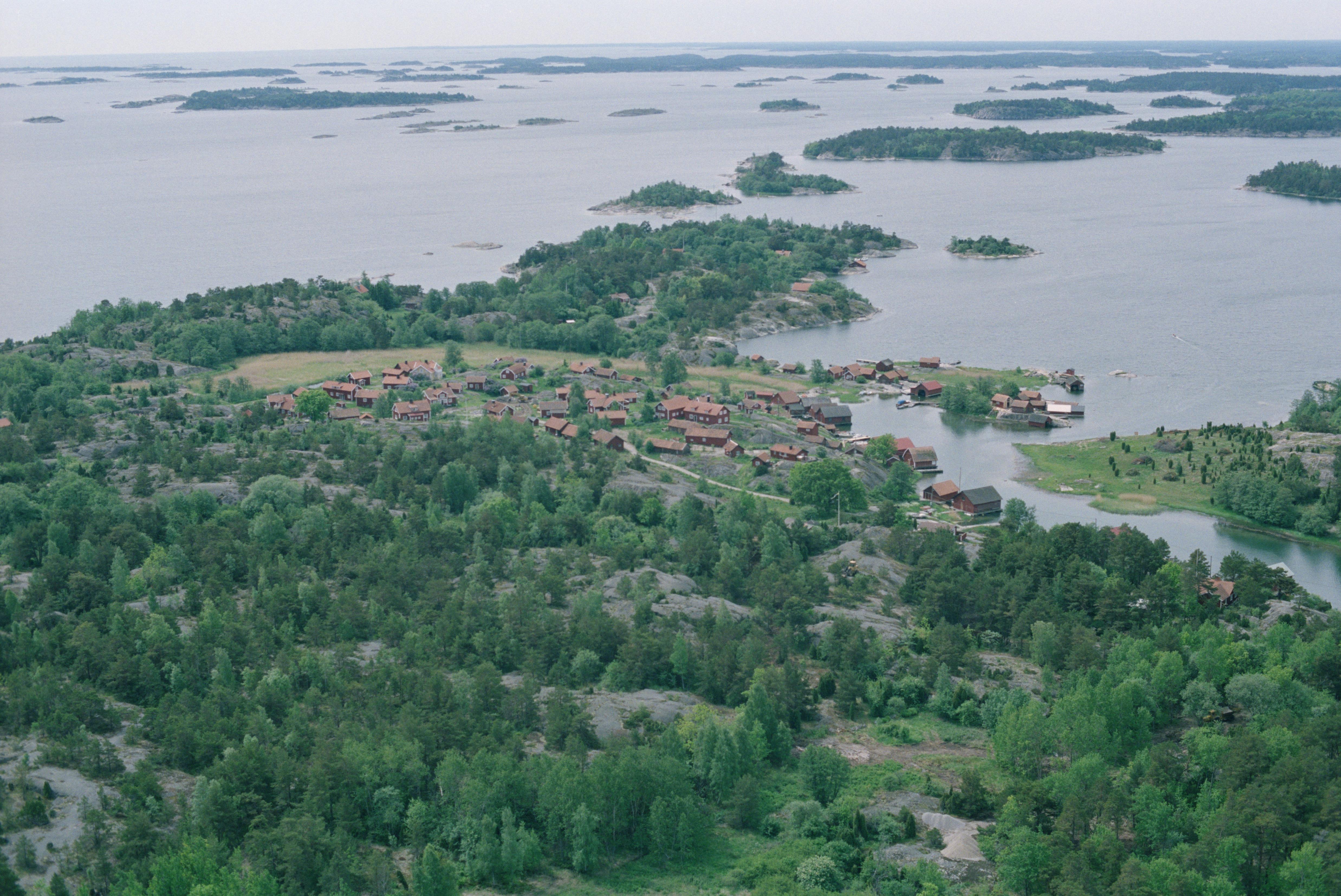 Beskrivning: Gryts skärgård. Ön Harstena, sydvästra delen. Harstena fiskeläge och lotshamn. Ett träd (ek) RAÄnr Gryt 101:1 i byn. Bilden är tagen mot (väderstreck): SSV