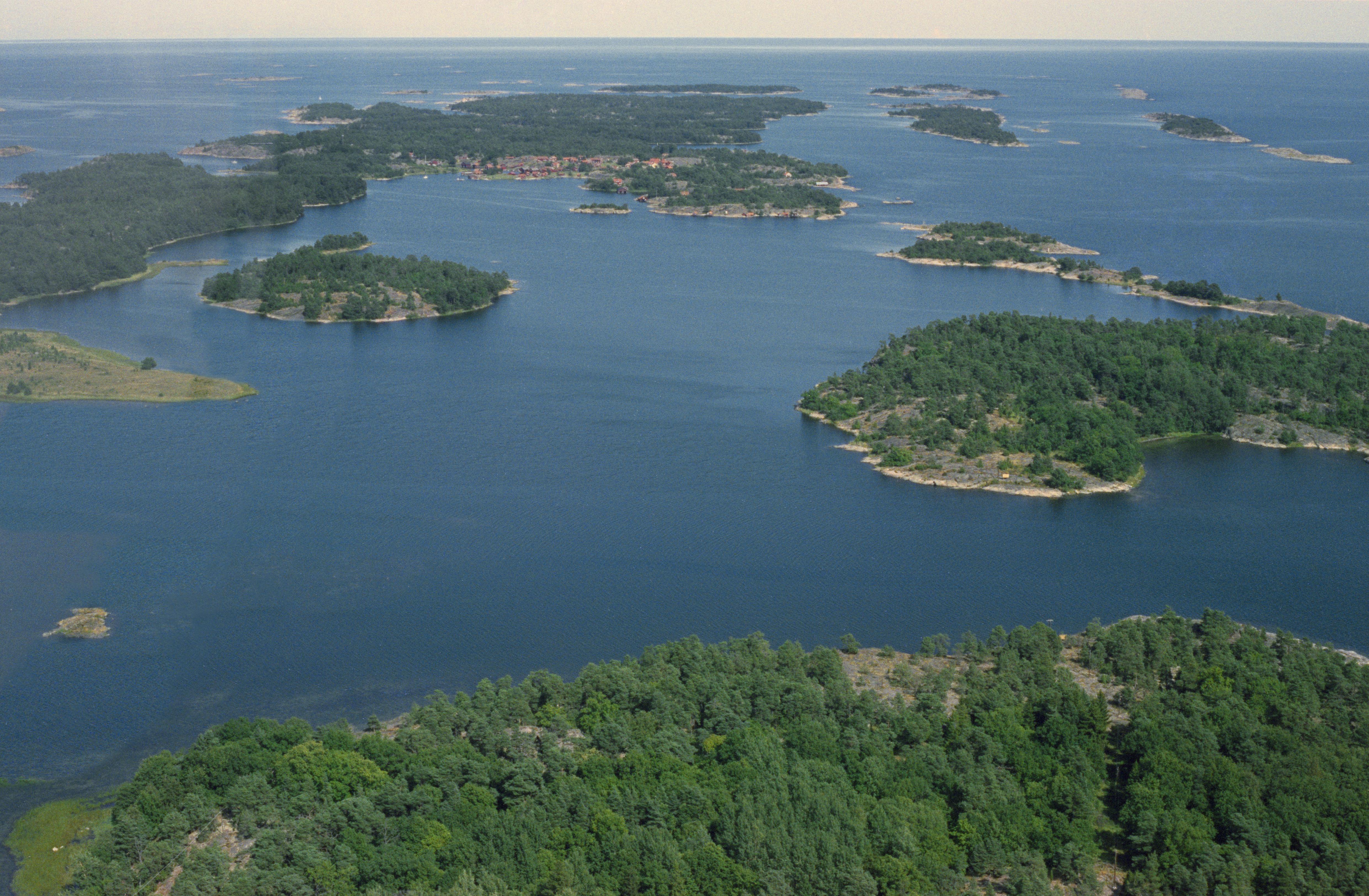 Beskrivning: Gryts skärgård. Husfjärden. Birkenholmen uppe till vänster om bildens mitt. I bildens övre del ön Harstena med Harstena fiskeläge och ett träd (ek) RAÄnr Gryt 101:1. Bilden är tagen mot (väderstreck): NO
