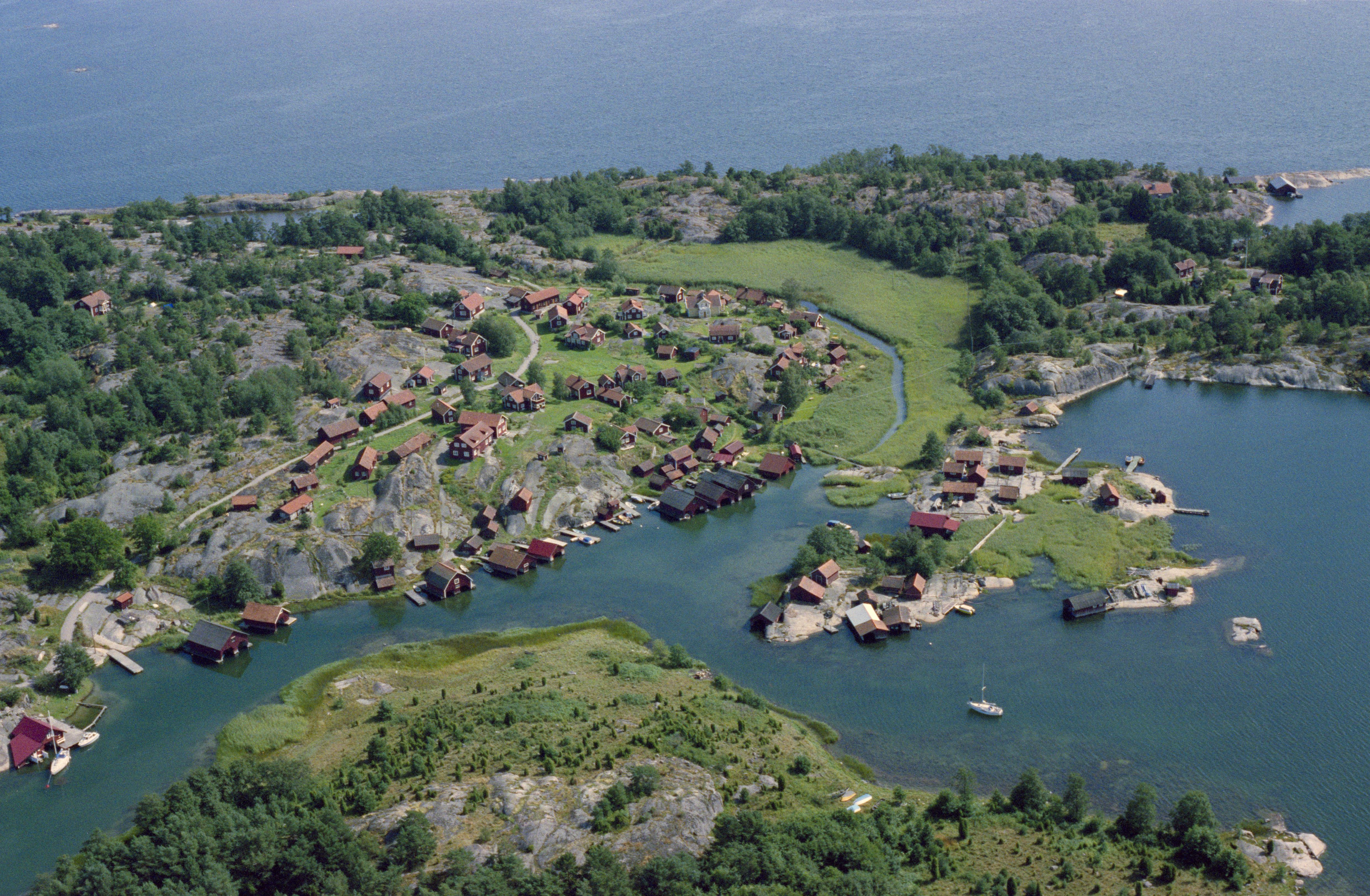 Beskrivning: Gryts skärgård. Ön Harstena, sydvästra delen. Harstena fiskeläge och lotshamn. Ett träd (ek) RAÄnr Gryt 101:1 i byn. Bilden är tagen mot (väderstreck): SO