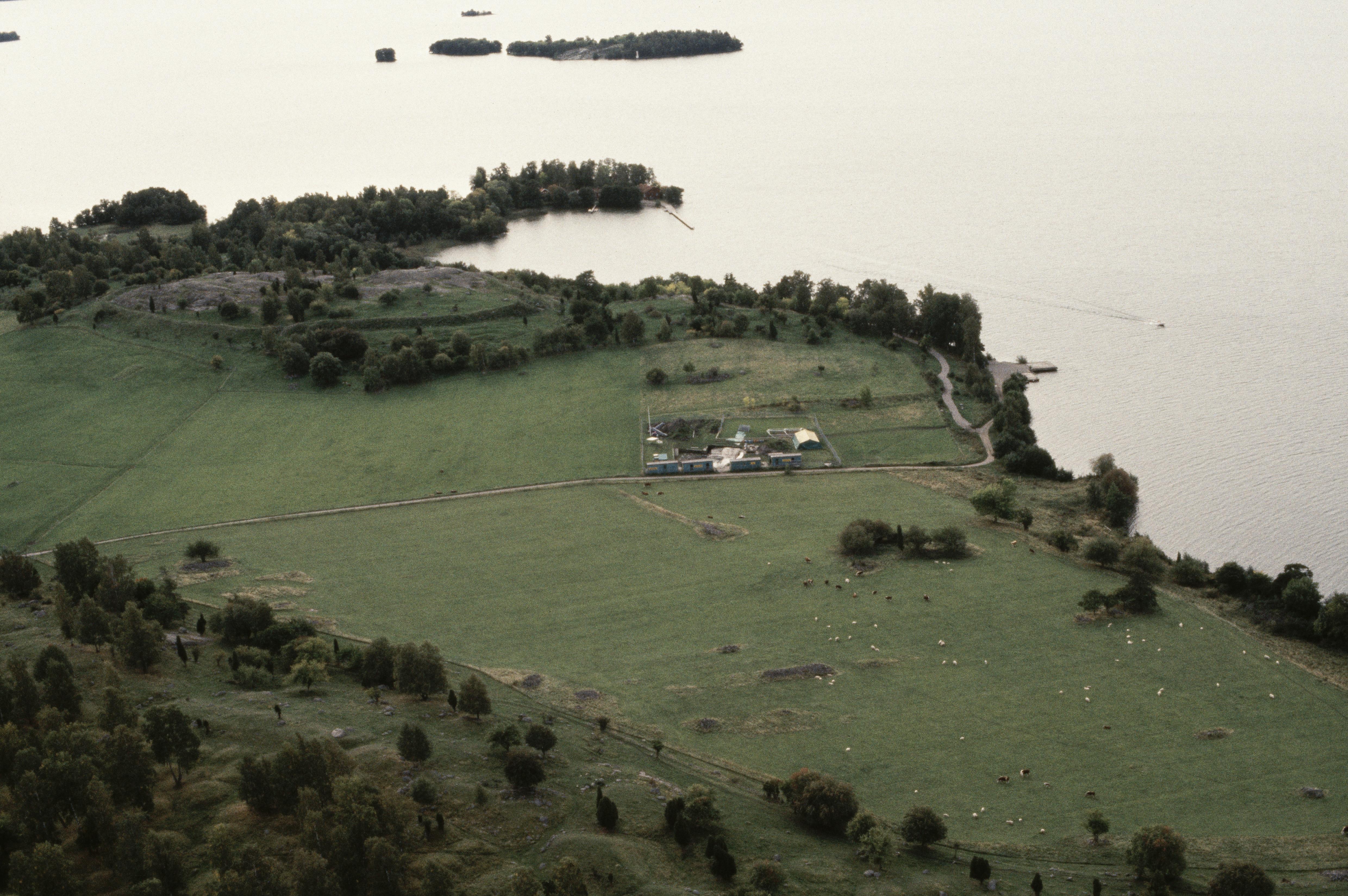 Beskrivning: Fornlämningsområdet Birka på Björkö i Mälaren. Vid bildens mitt arkeologisk undersökning i bo- och gravplats Hemlanden och Svarta jorden RAÄnr Adelsö 118:1 vid Stadsvallen Adelsö 119:1-2. Uppe till vänster gravfält Borgs hage RAÄnr Adelsö 35:1 och fornborg Borg Adelsö 34:1 vid Ångholmen. Bilden är tagen mot (väderstreck): SSV