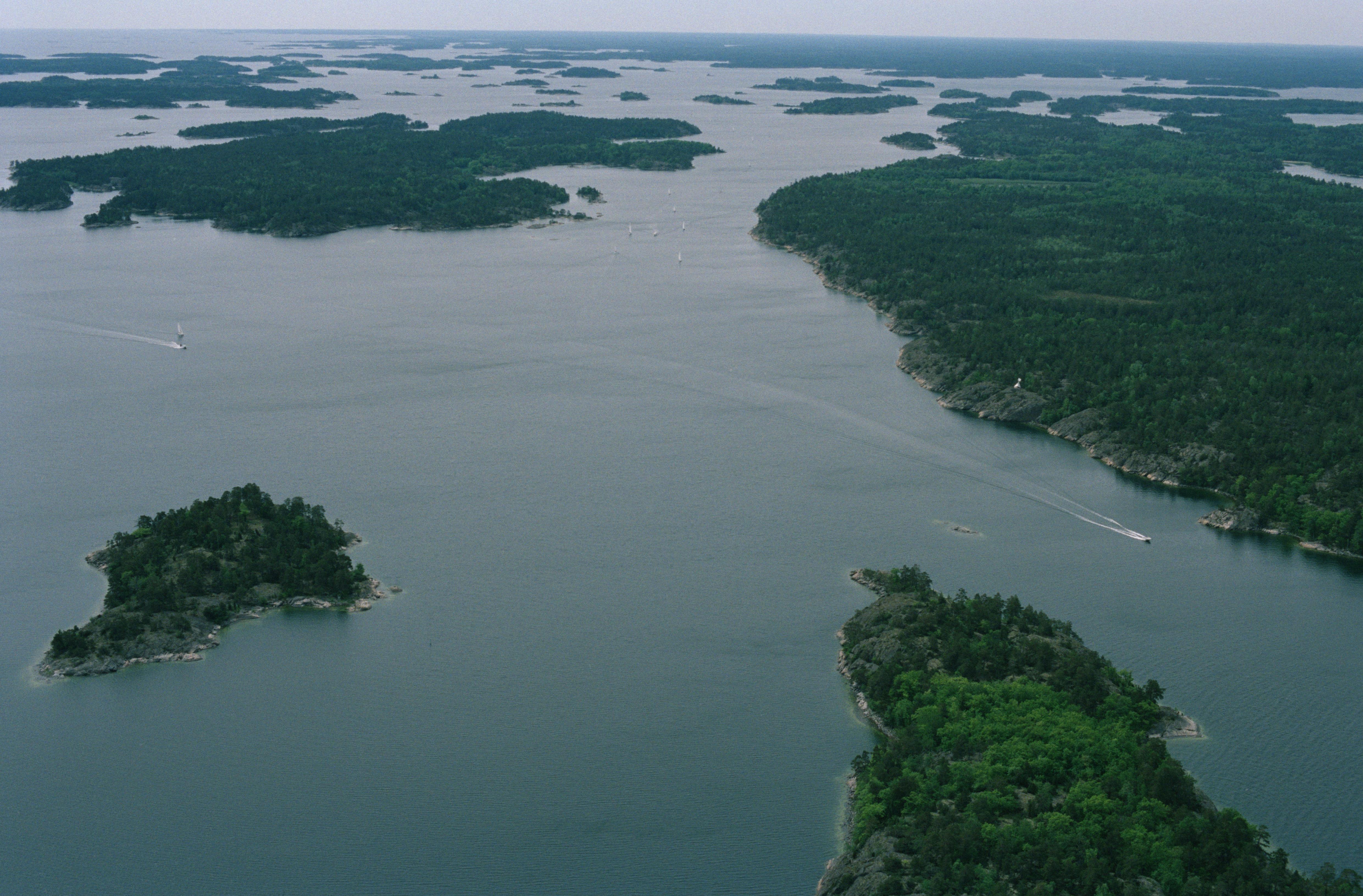 Beskrivning: Gryts skärgård. Sjömärke RAÄnr Gryt 174:1 på Snuggholmen nere till höger. Håskö uppe till vänster, Väggö uppe till höger. Bilden är tagen mot (väderstreck): SSV