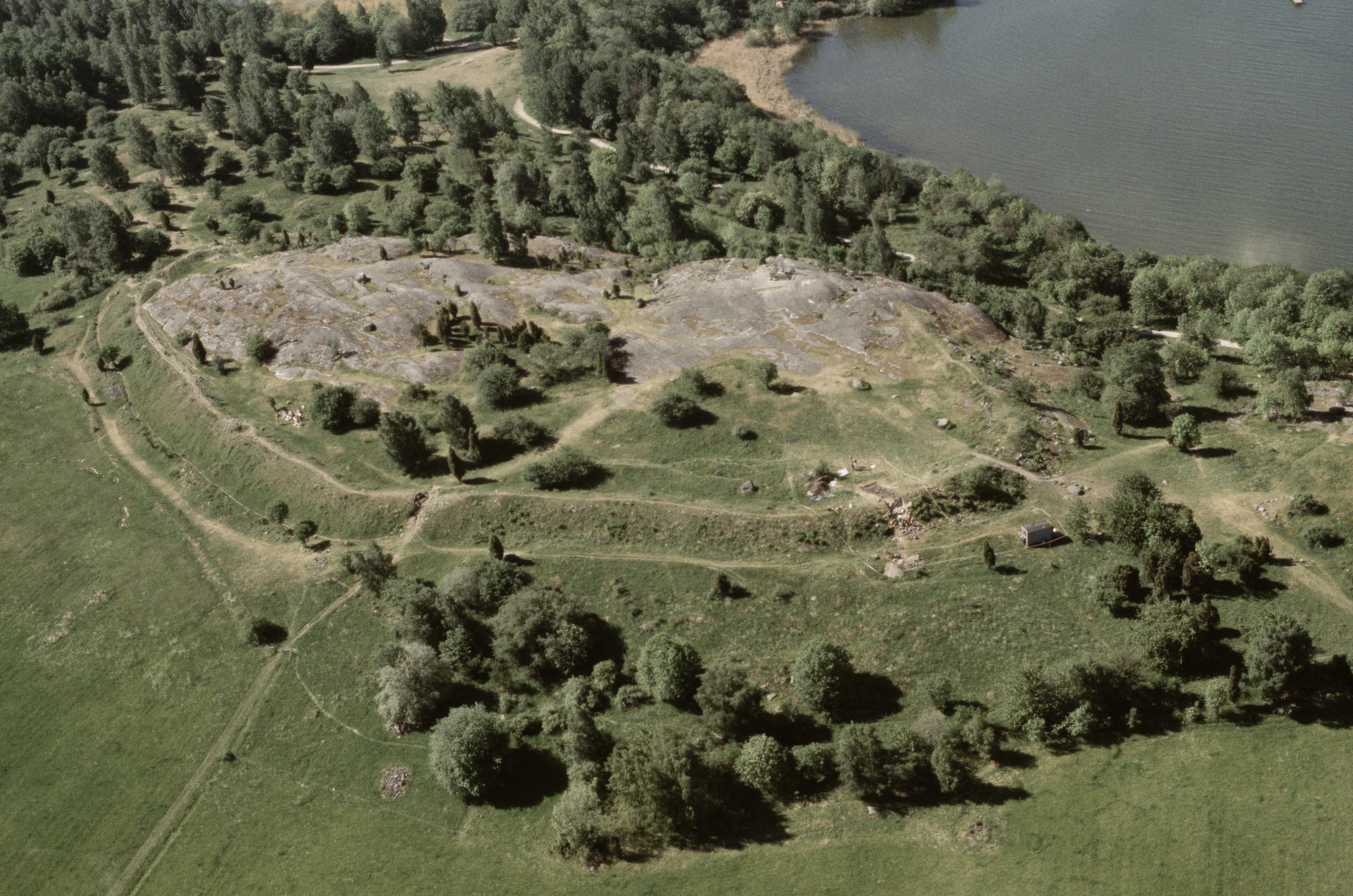 Beskrivning: Fornlämningsområdet Birka på Björkö i Mälaren. Till höger om bildens mitt arkeologisk undersökning i vallen till fornborg Borg RAÄnr Adelsö 34:1 vid Ansgarsmonumentet. I bildens övre del gravfält Borgs hage RAÄnr Adelsö 35:1. Bilden är tagen mot (väderstreck): SSV