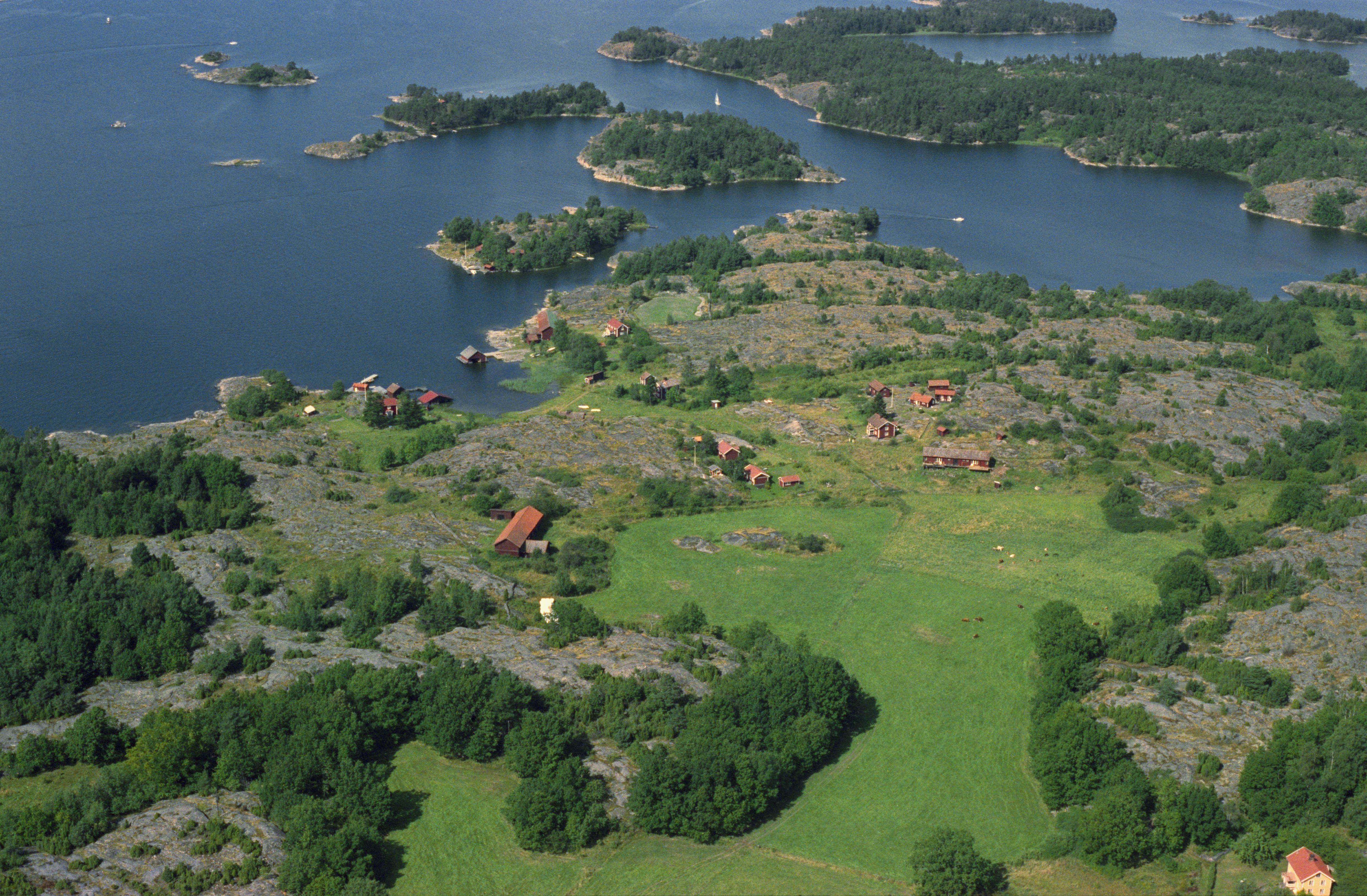 Beskrivning: Gryts skärgård. Ön Kråkmarö, södra delen. Kråkmarö by. Fossil åker RAÄnr Gryt 226 och 227 till vänster om bildens mitt. Bilden är tagen mot (väderstreck): NV