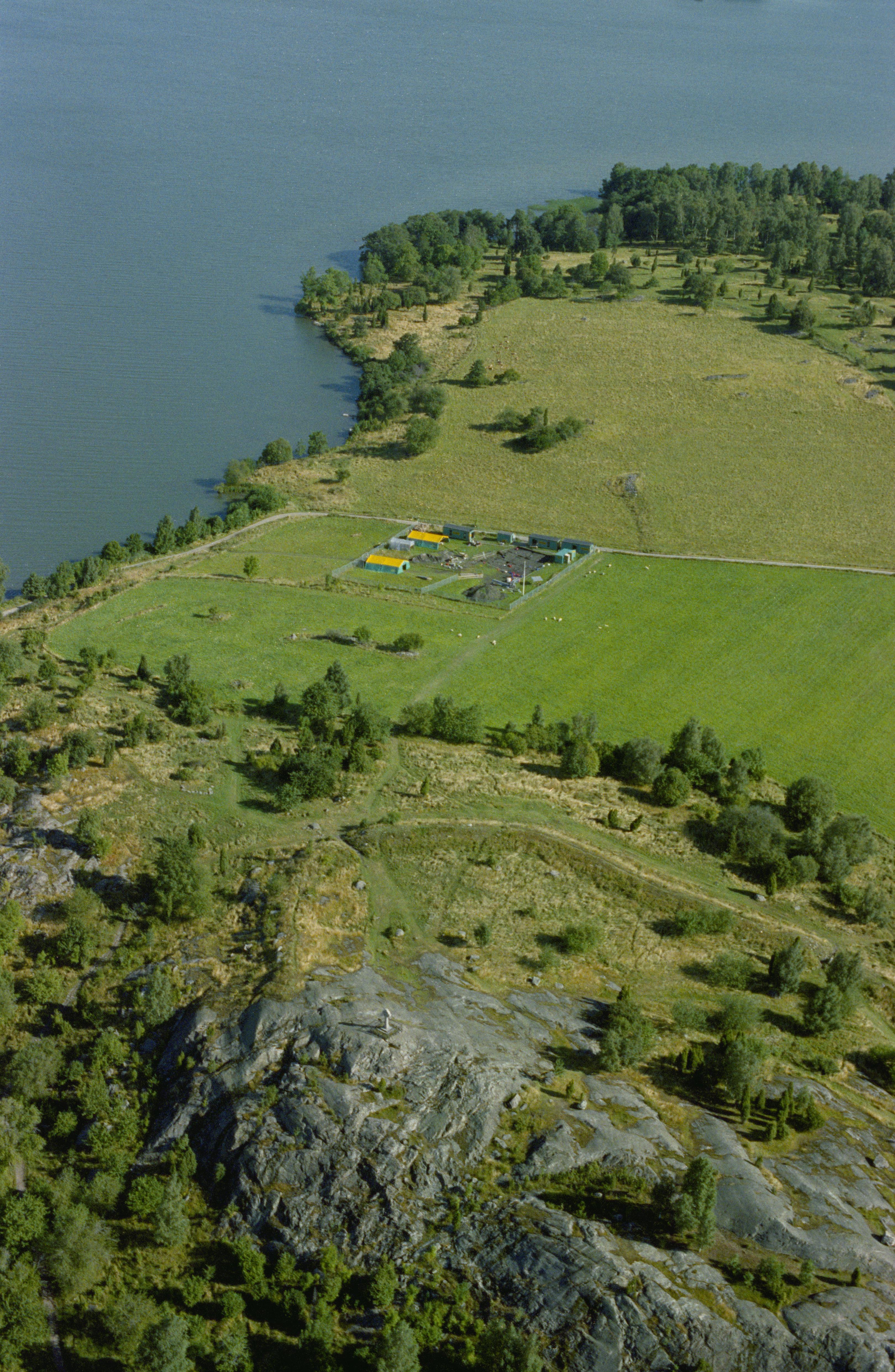 Beskrivning: Fornlämningsområdet Birka på Björkö i Mälaren. Vid bildens mitt fornborg Borg RAÄnr Adelsö 34:1 och arkeologisk undersökning i norra delen av ön i bo- och gravplats Hemlanden och Svarta jorden RAÄnr Adelsö 118:1 vid Stadsvallen Adelsö 119:1-2. Bilden är tagen mot (väderstreck): NNO