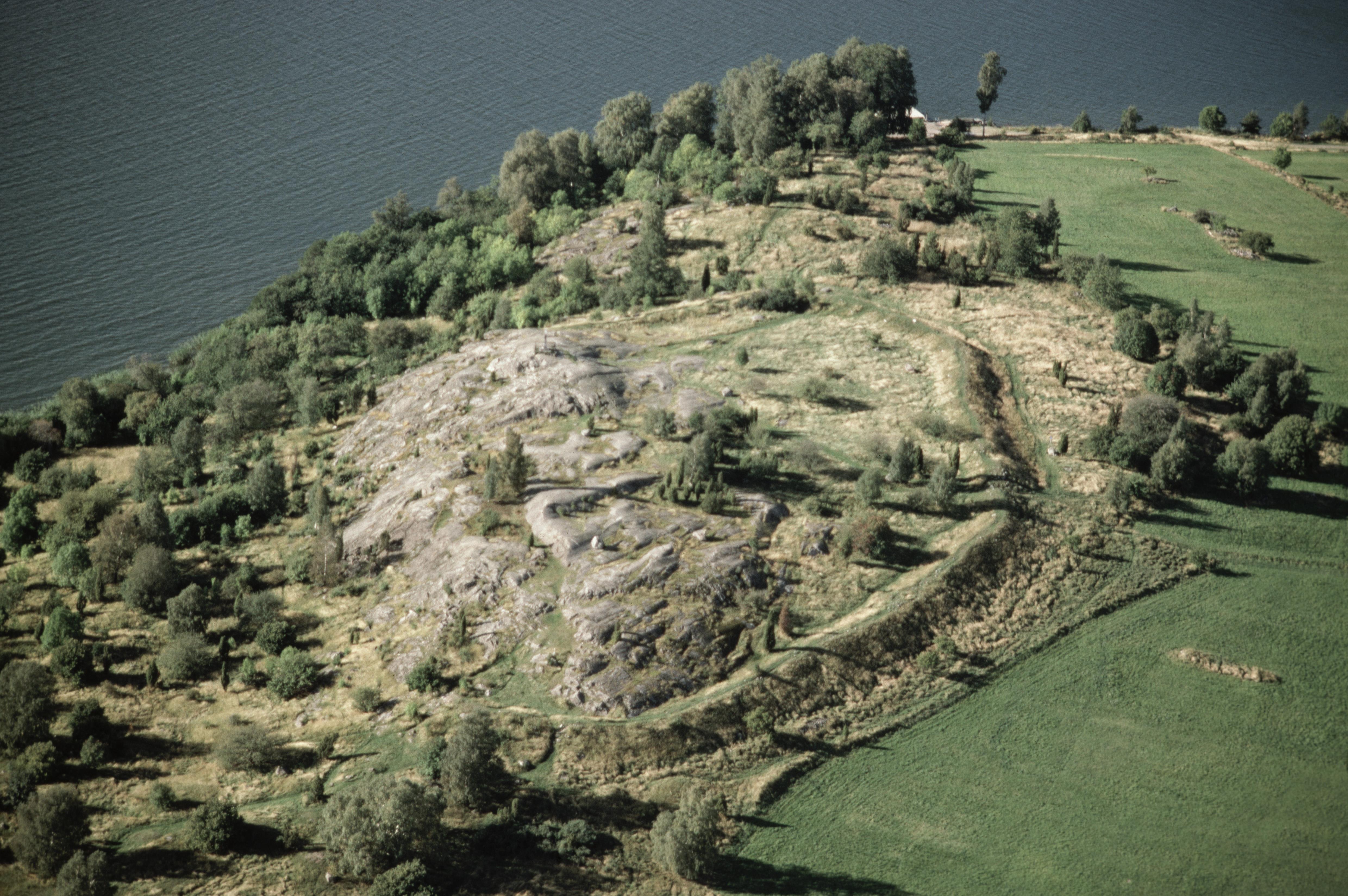 Beskrivning: Fornlämningsområdet Birka på Björkö i Mälaren. Fornborg Borg RAÄnr Adelsö 34:1. I bildens nedre del gravfält Borgs hage Adelsö 35:1. Bilden är tagen mot (väderstreck): NV
