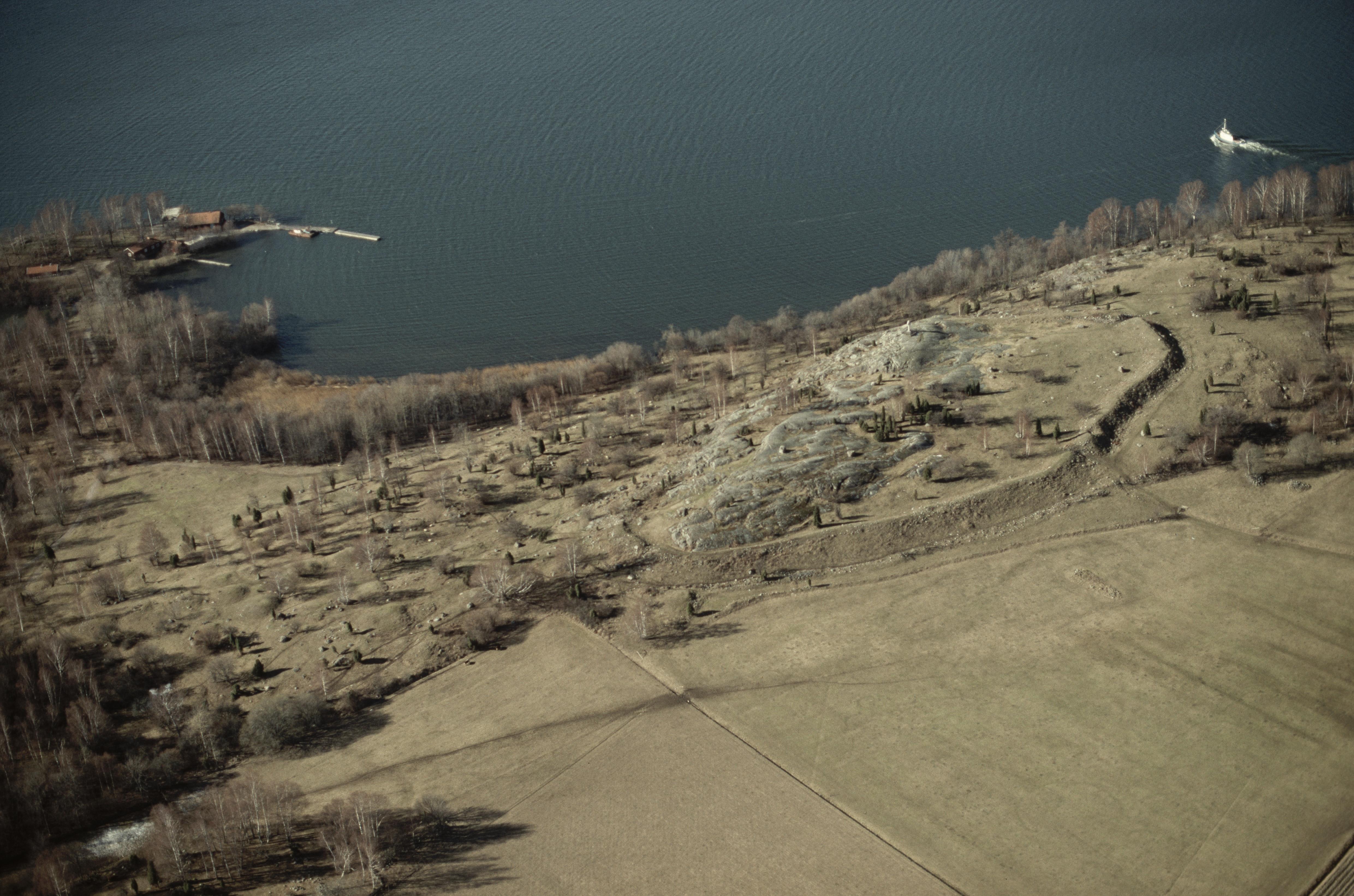 Beskrivning: Fornlämningsområdet Birka på Björkö i Mälaren. Fornborg Borg RAÄnr Adelsö 34:1. Till vänster Ångholmen och gravfält Borgs hage RAÄnr Adelsö 35:1. Bilden är tagen mot (väderstreck): V