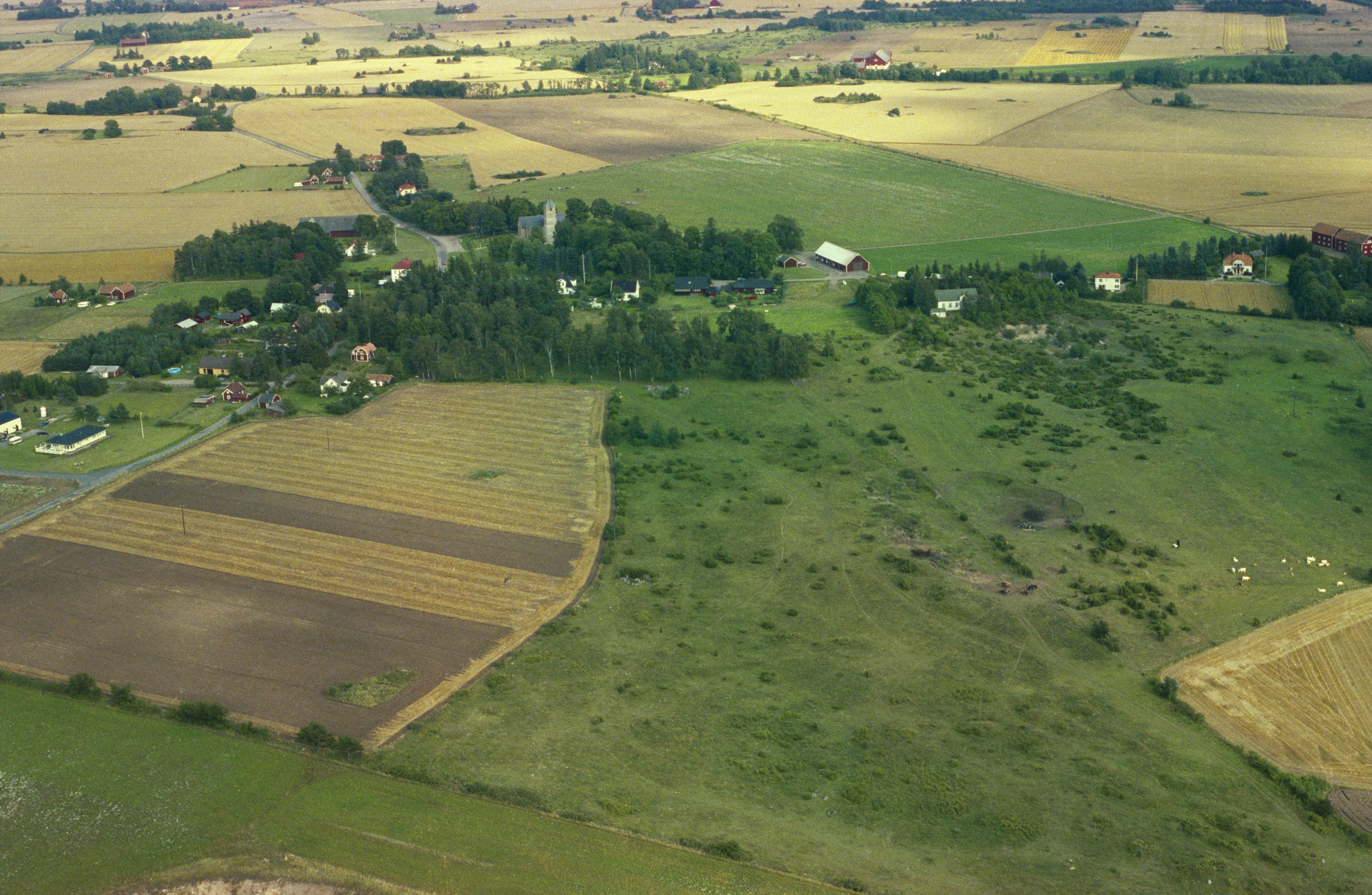 Beskrivning: I bildens nedre del gravfält Jussbergs kulle RAÄnr Heda 20:1. Heda kyrka över bildens mitt. Bilden är tagen mot (väderstreck): OSO