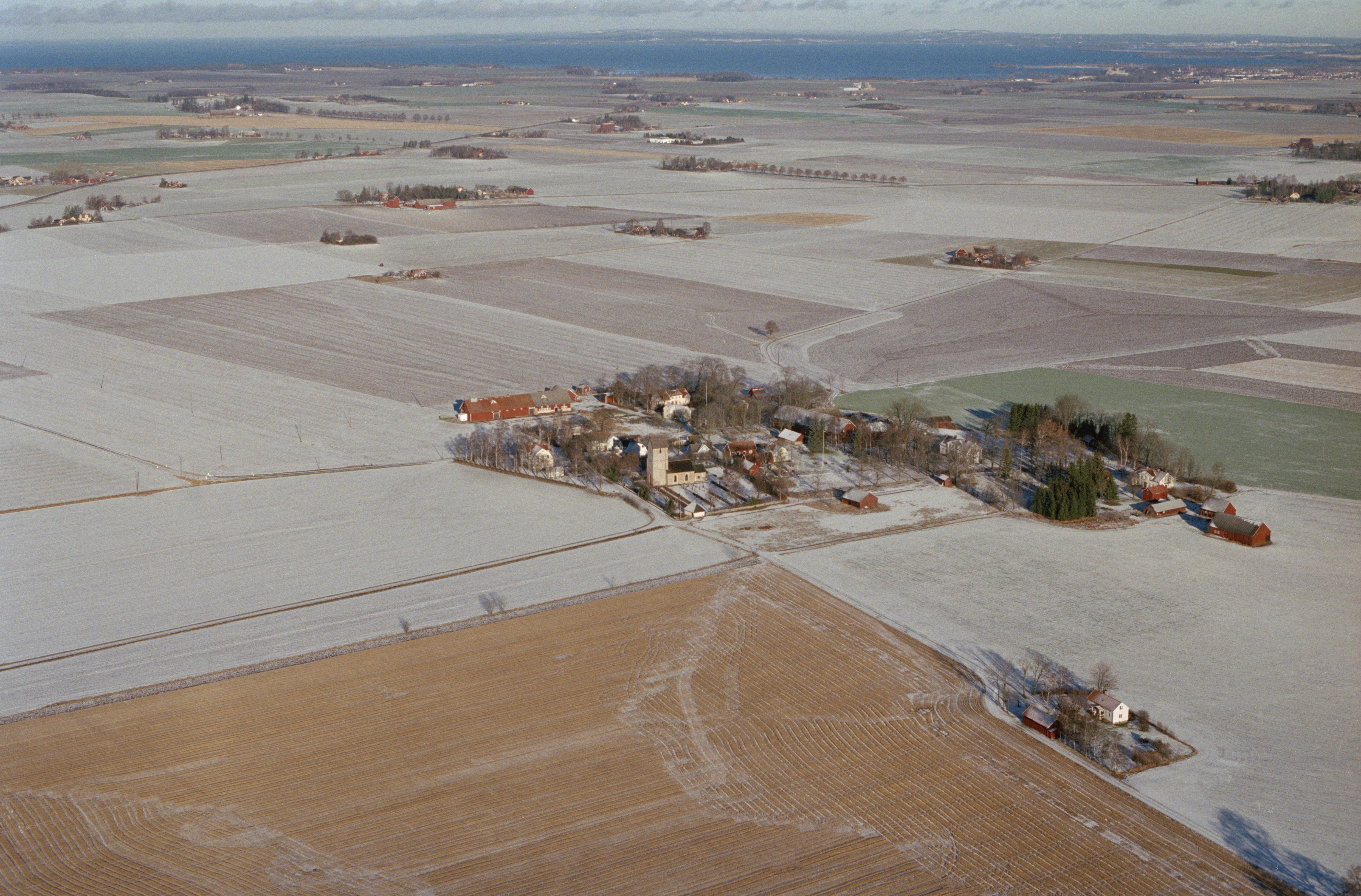 Beskrivning: Herrestads kyrka och kyrkby. Bilden är tagen mot (väderstreck): N
