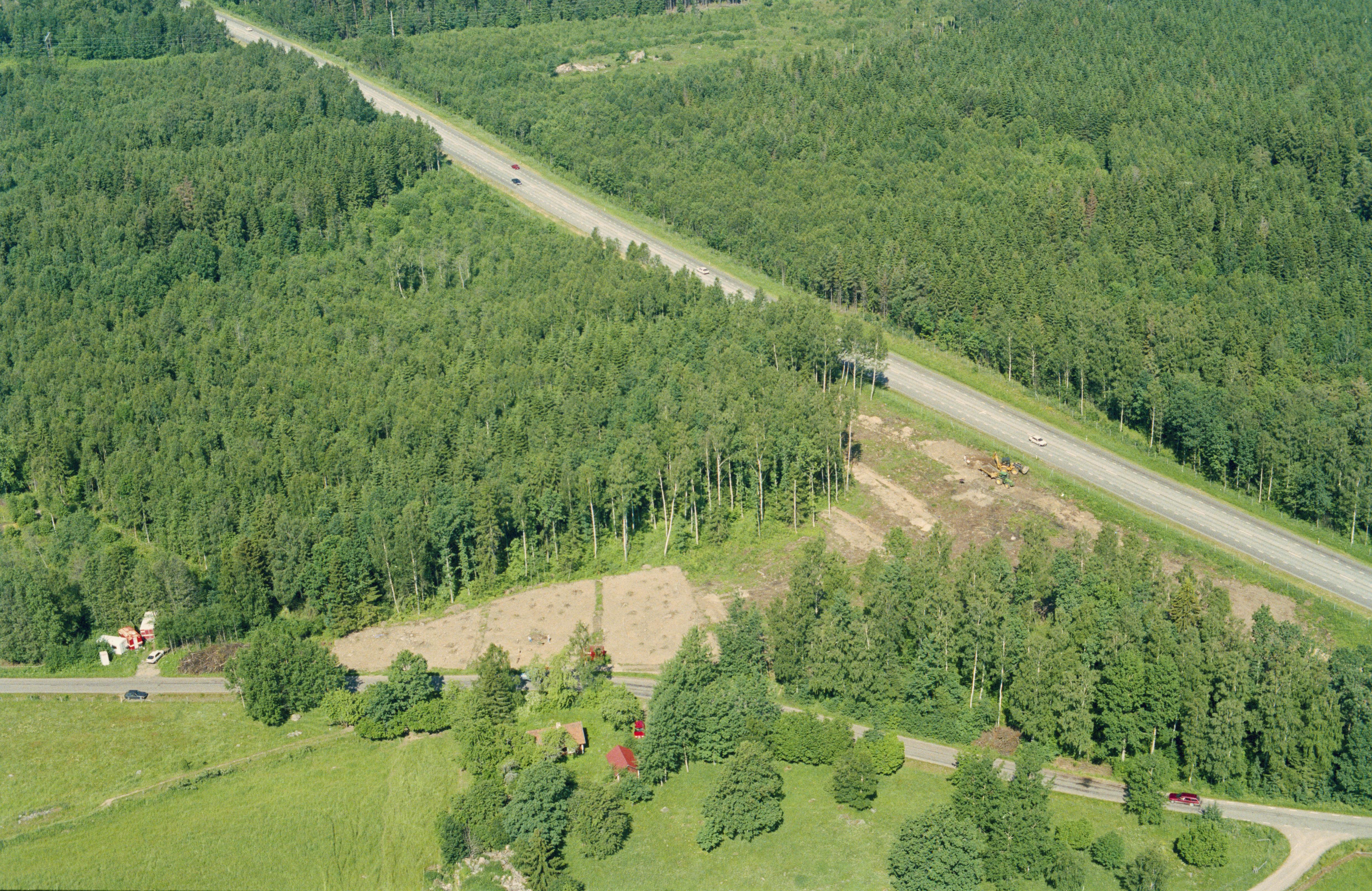 Beskrivning: Arkeologisk undersökning innan bygging av väg E4, vid gränsen mot socknen Hogstad (uppe till höger) och Väderstad (uppe till vänster). Vid bildens mitt hägnad RAÄnr Hogstad 166:1-2. Nere till vänster stensättning RAÄnr Rinna 215:1. Bilden är tagen mot (väderstreck): VNV