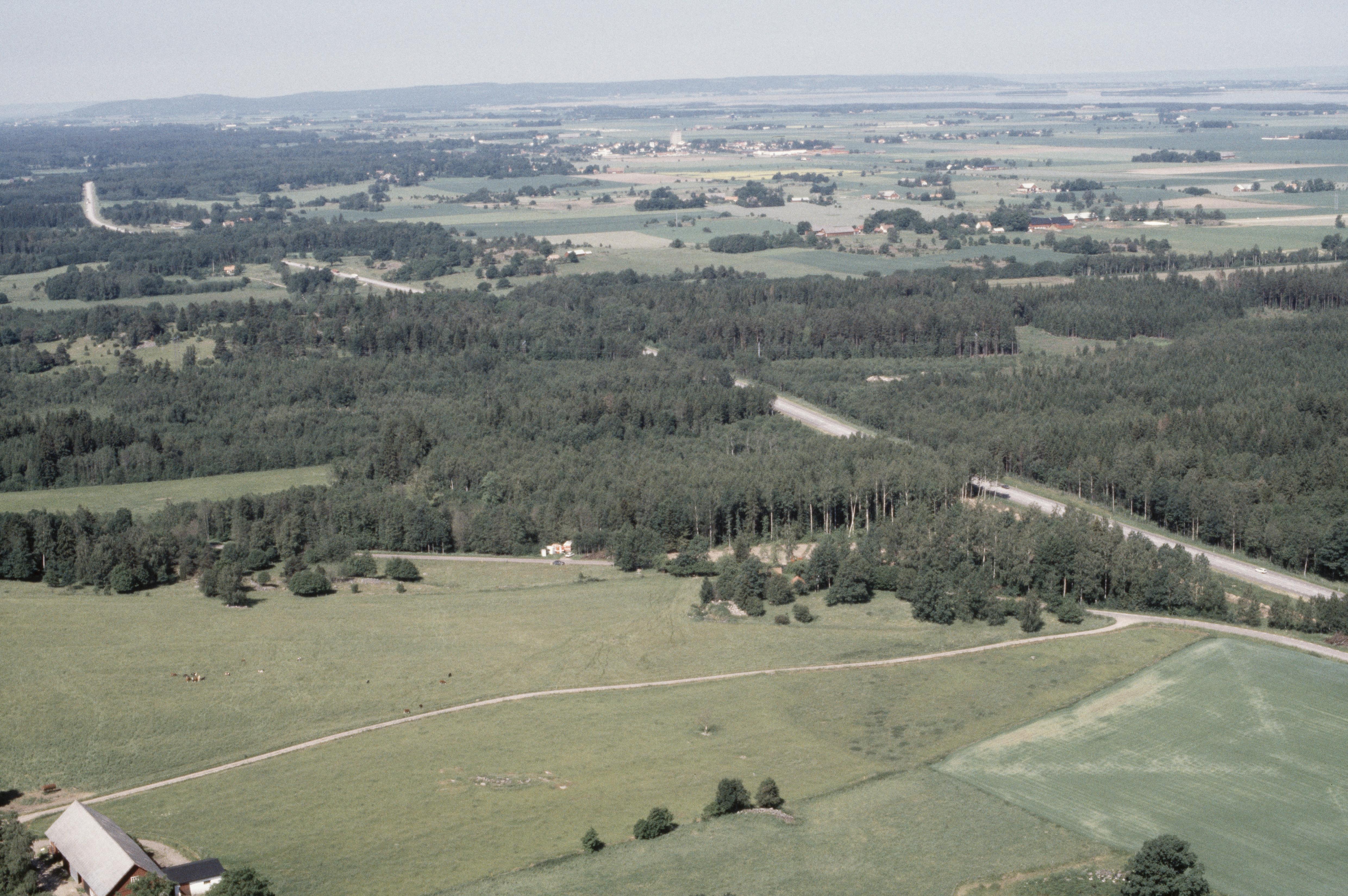 Beskrivning: Arkeologisk undersökning innan bygging av väg E4, vid gränsen mot socknen Hogstad (uppe till höger) och Väderstad (uppe till vänster). Vid bildens mitt hägnad RAÄnr Hogstad 166:1-2. Nere till höger stensättningar RAÄnr Rinna 18:1-3. Bilden är tagen mot (väderstreck): VNV