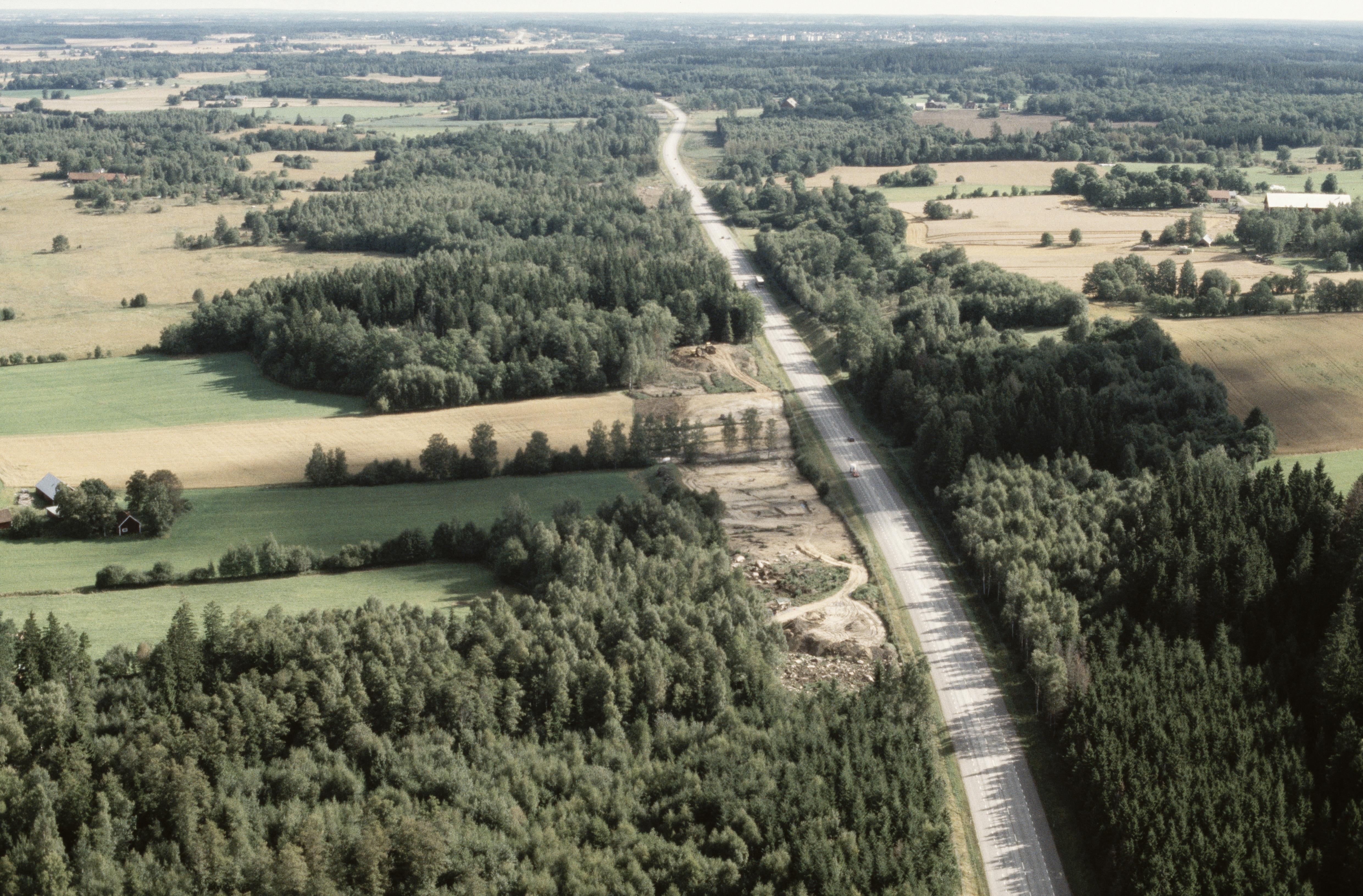 Beskrivning: Arkeologisk undersökning innan bygging av väg E4 i området Mörby, Jordsfälle, Stora och Lilla Ljuna. Boplats RAÄnr Hogstad 168:1 under bildens mitt. Bilden är tagen mot (väderstreck): Ö