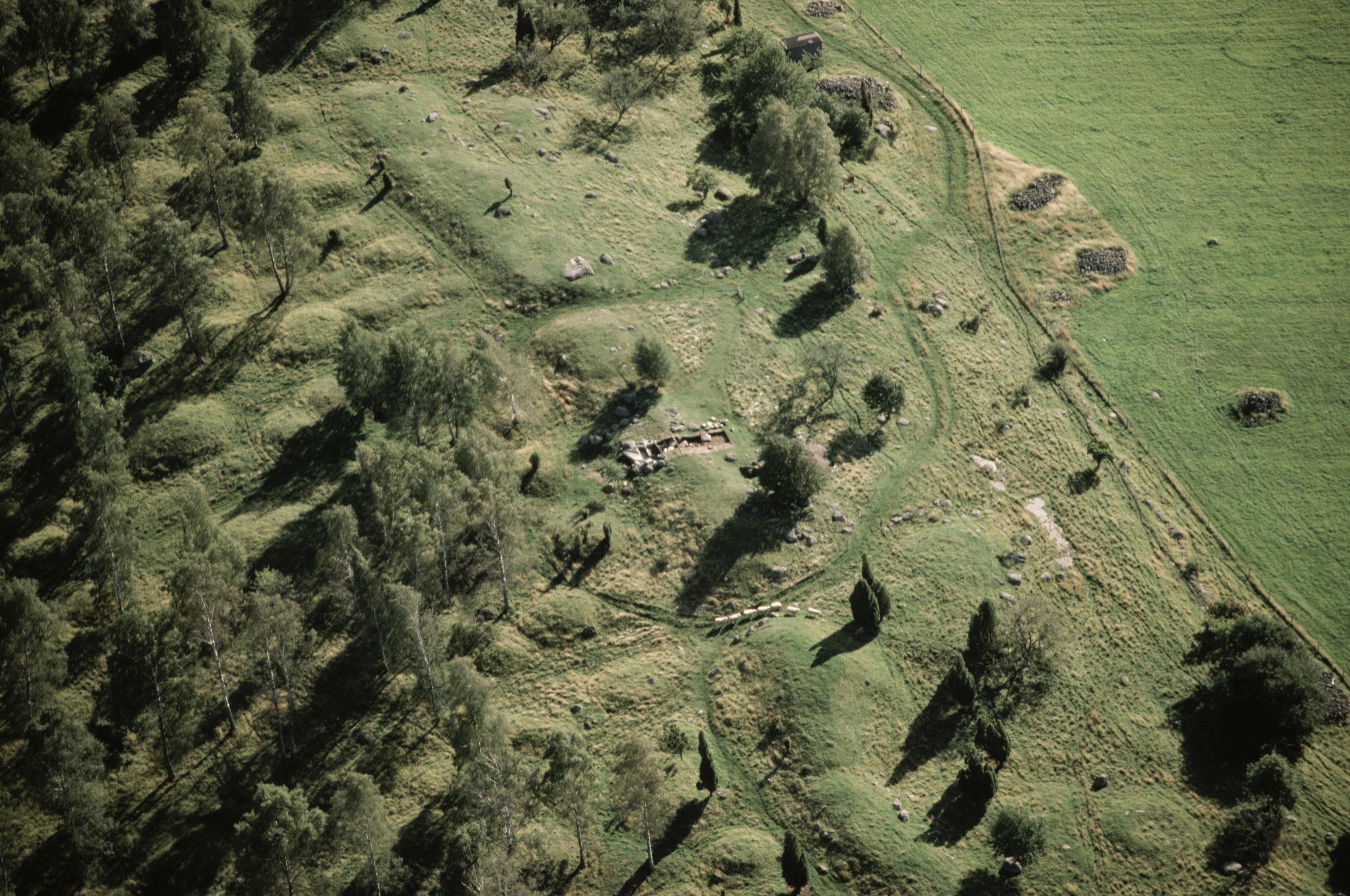 Beskrivning: Fornlämningsområdet Birka på Björkö i Mälaren. Norra delen av ön vid Stadsvallen RAÄnr Adelsö 119:1-2 och området Hemlanden och Svarta jorden RAÄnr Adelsö 118:1. Bilden är tagen mot (väderstreck): SSV
