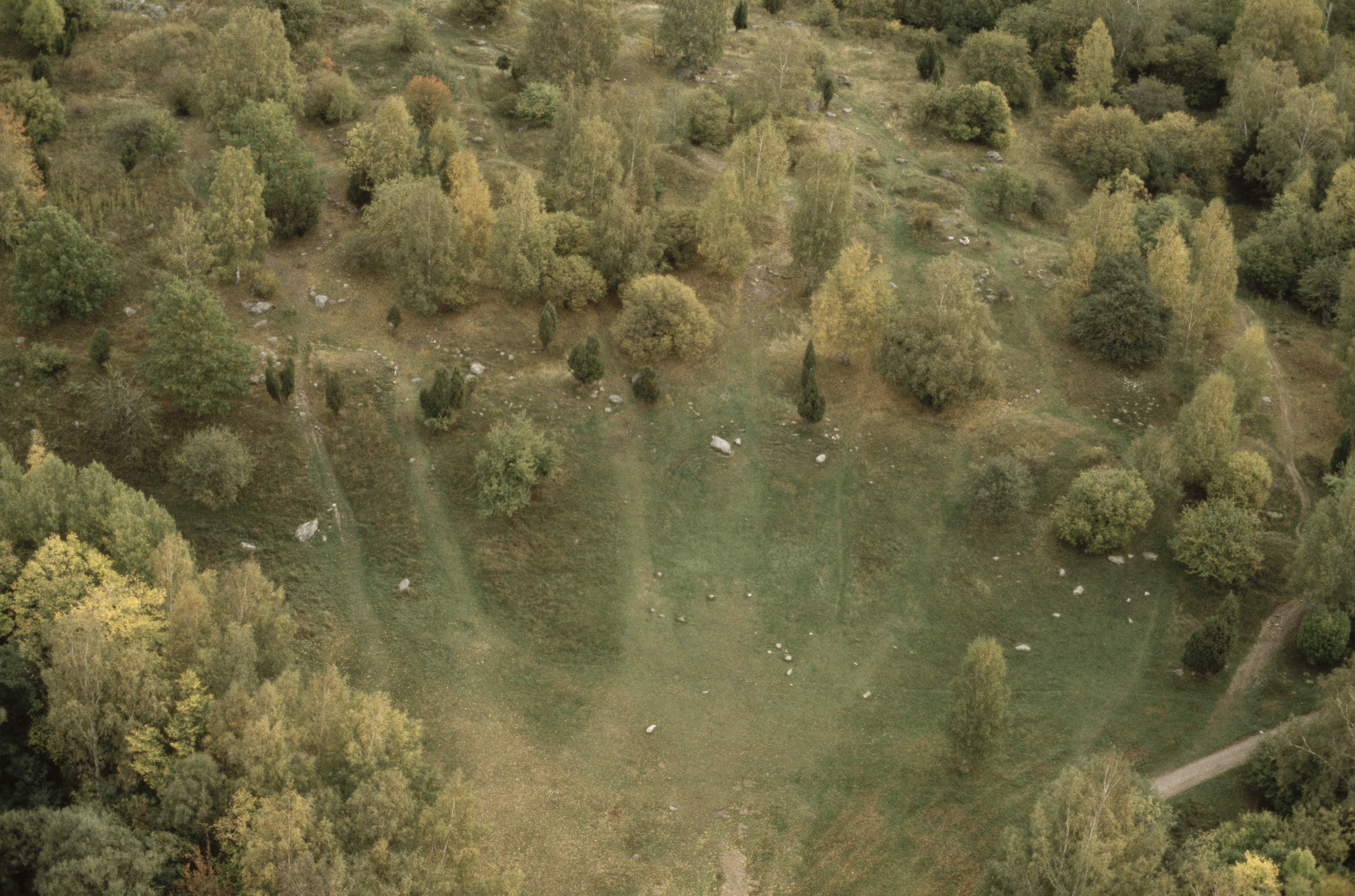 Beskrivning: Fornlämningsområdet Birka på Björkö i Mälaren. Stigar i gravfält Borgs hage RAÄnr Adelsö 35:1 vid fornborg Borg RAÄnr Adelsö 34:1. Bilden är tagen mot (väderstreck): NNO