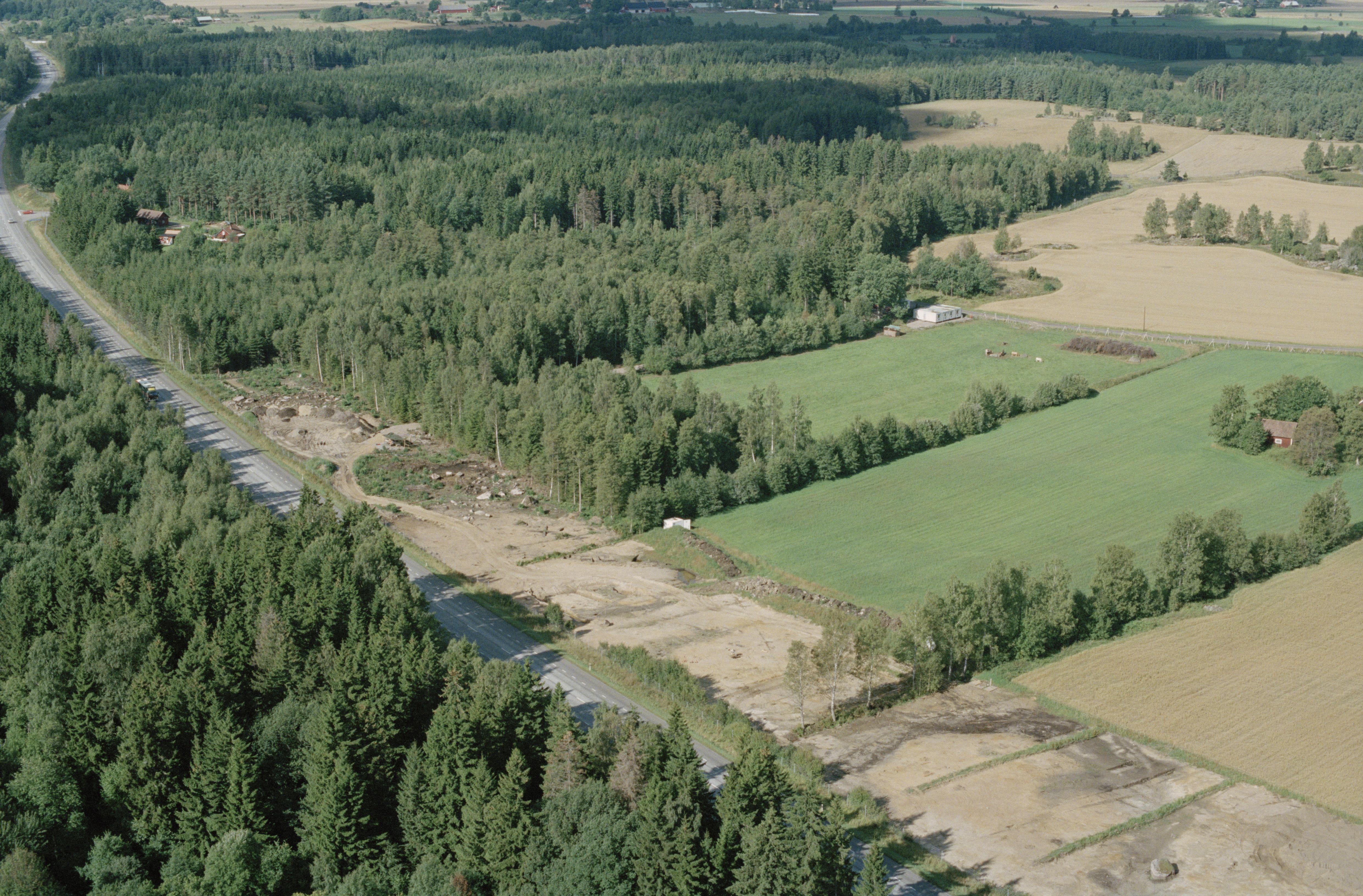 Beskrivning: Arkeologisk undersökning innan bygging av väg E4 i området Mörby, Jordsfälle, Stora och Lilla Ljuna. Boplats RAÄnr Hogstad 168:1 vid bildens mitt. Väderstads socken i bildens övre del. Bilden är tagen mot (väderstreck): NV