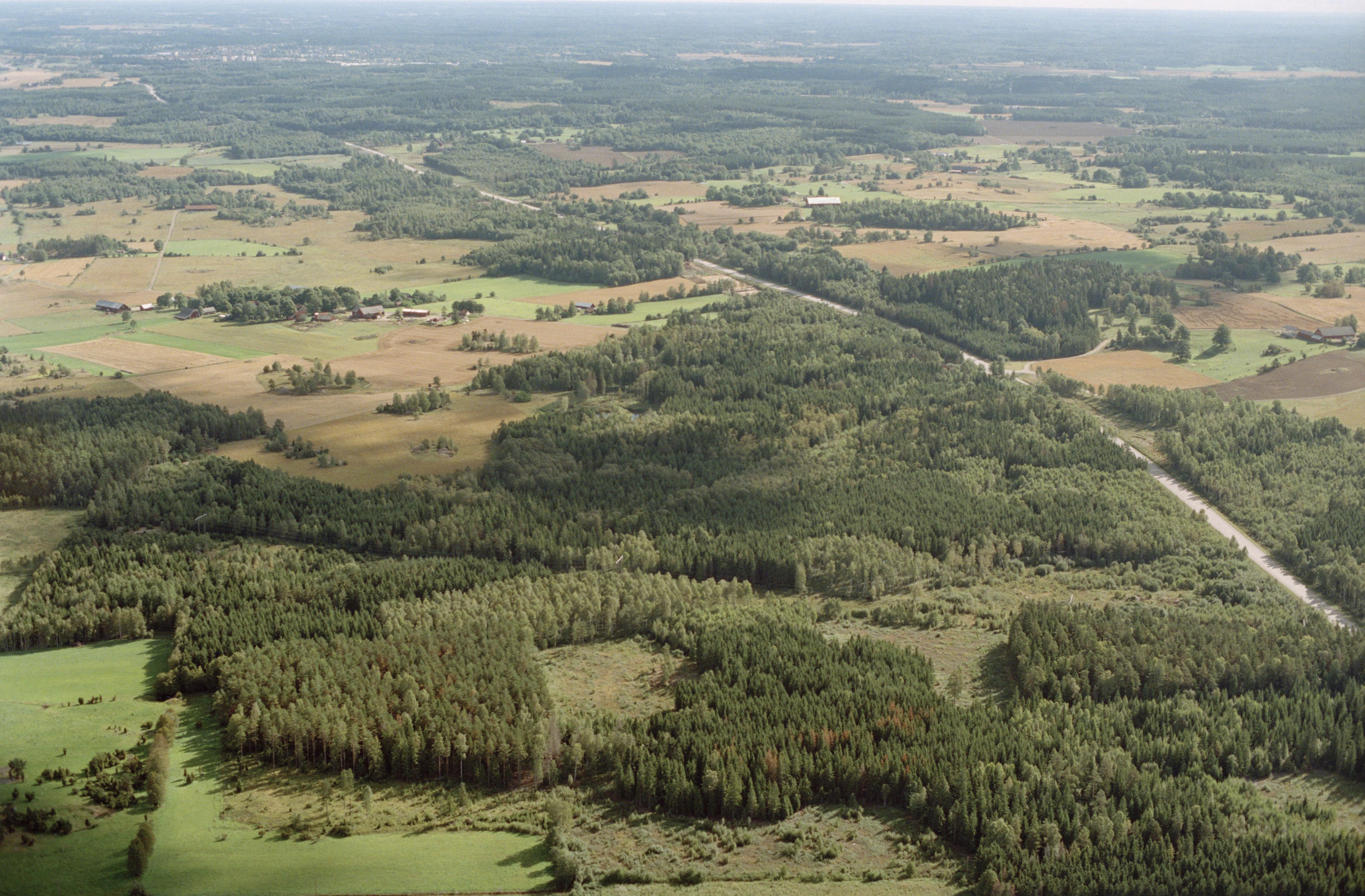 Beskrivning: Arkeologisk undersökning innan bygging av väg E4 i området Mörby, Jordsfälle, Stora och Lilla Ljuna. Boplats RAÄnr Hogstad 168:1 vid Mörby och Stora Ljuna i bildens mitt. I bildens övre del Väderstads socken. Bilden är tagen mot (väderstreck): Ö