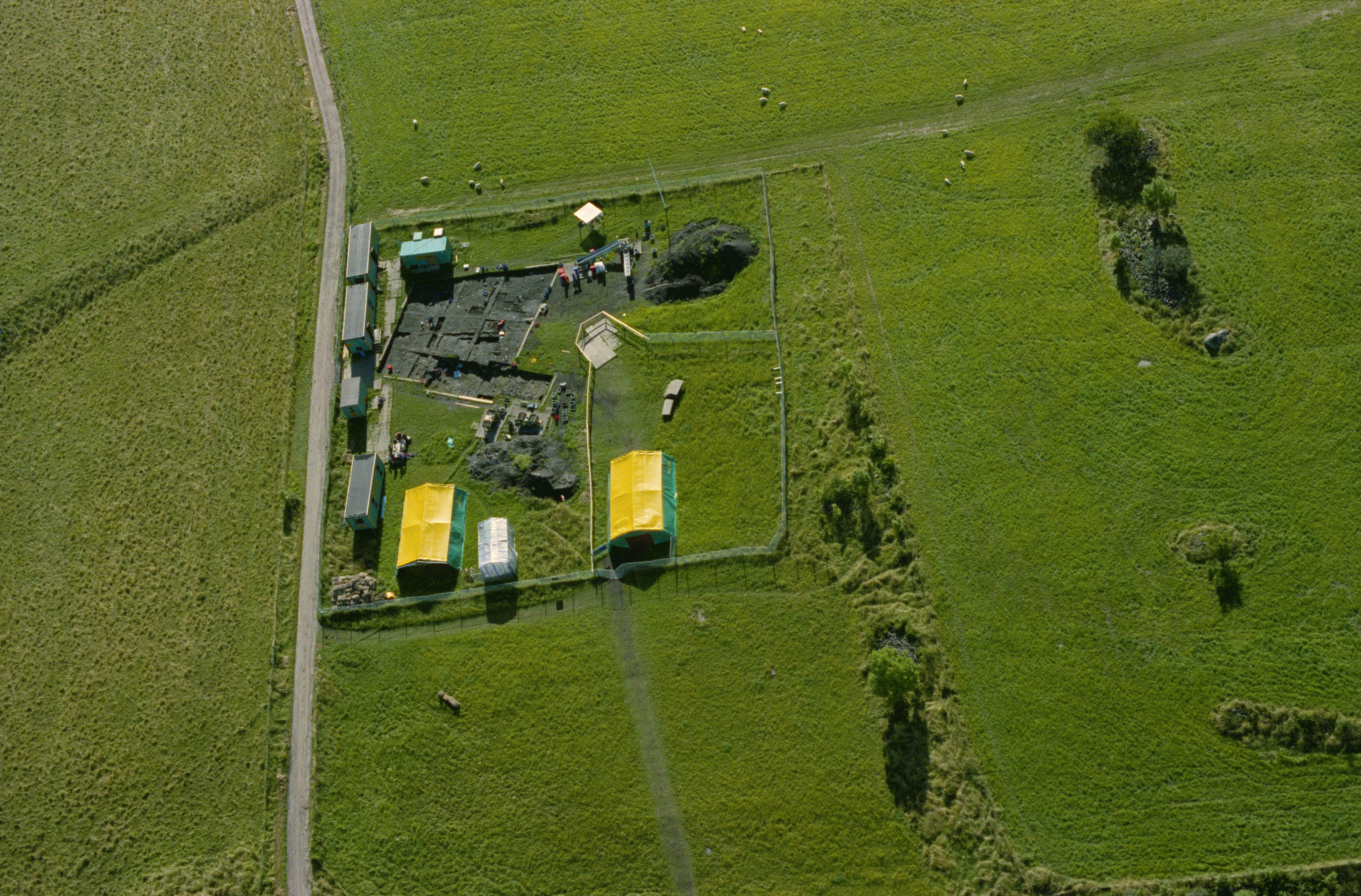 Beskrivning: Fornlämningsområdet Birka på Björkö i Mälaren. Arkeologisk undersökning i norra delen av ön i området Hemlanden och Svarta jorden RAÄnr Adelsö 118:1 vid Stadsvallen Adelsö 119:1-2. Bilden är tagen mot (väderstreck): OSO