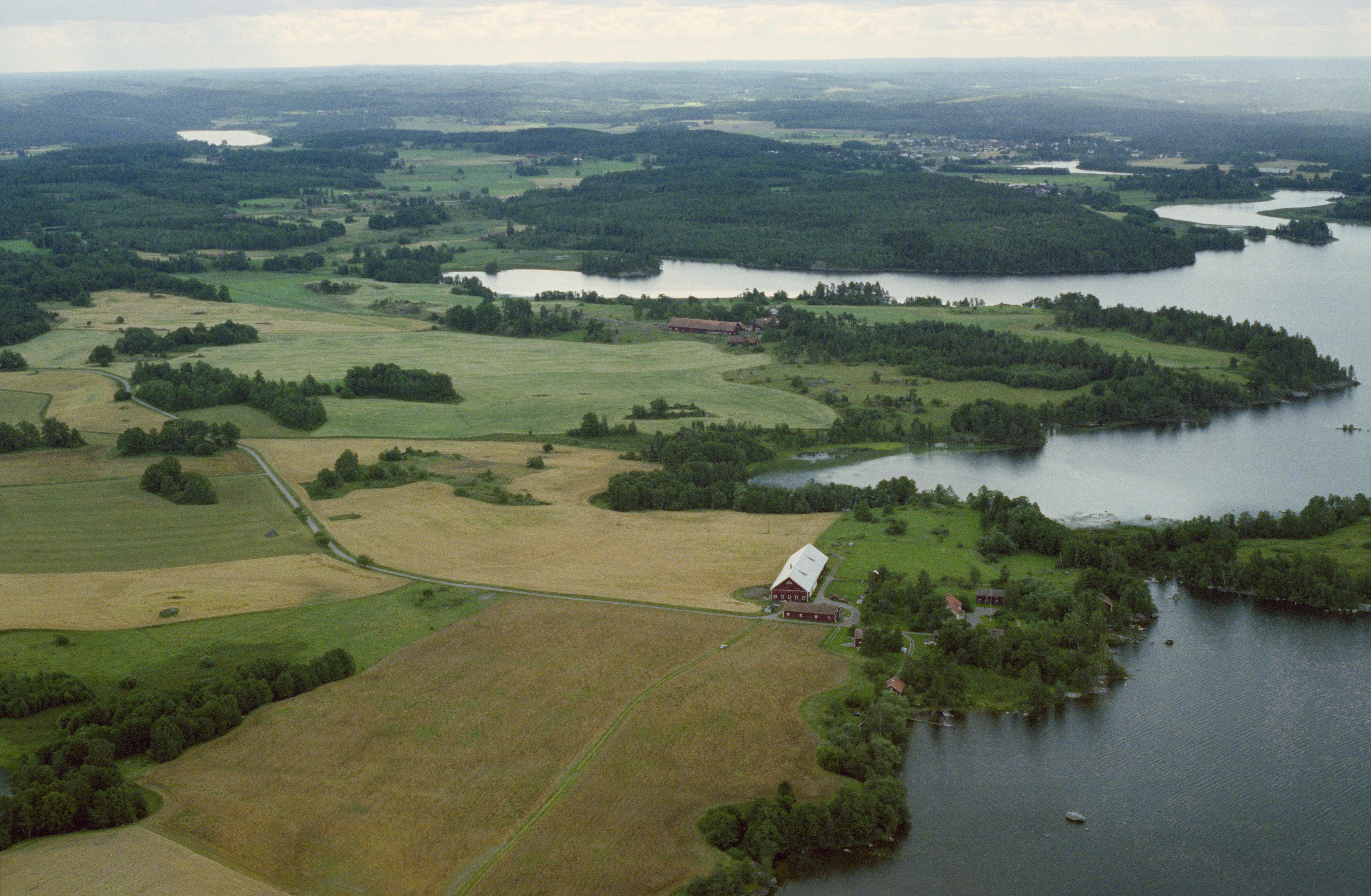Beskrivning: Sjön Åsunden. Hornsbergs herrgård. I bildens övre del Ekeby by med gravfält RAÄnr Horn 32:1. Bilden är tagen mot (väderstreck): S