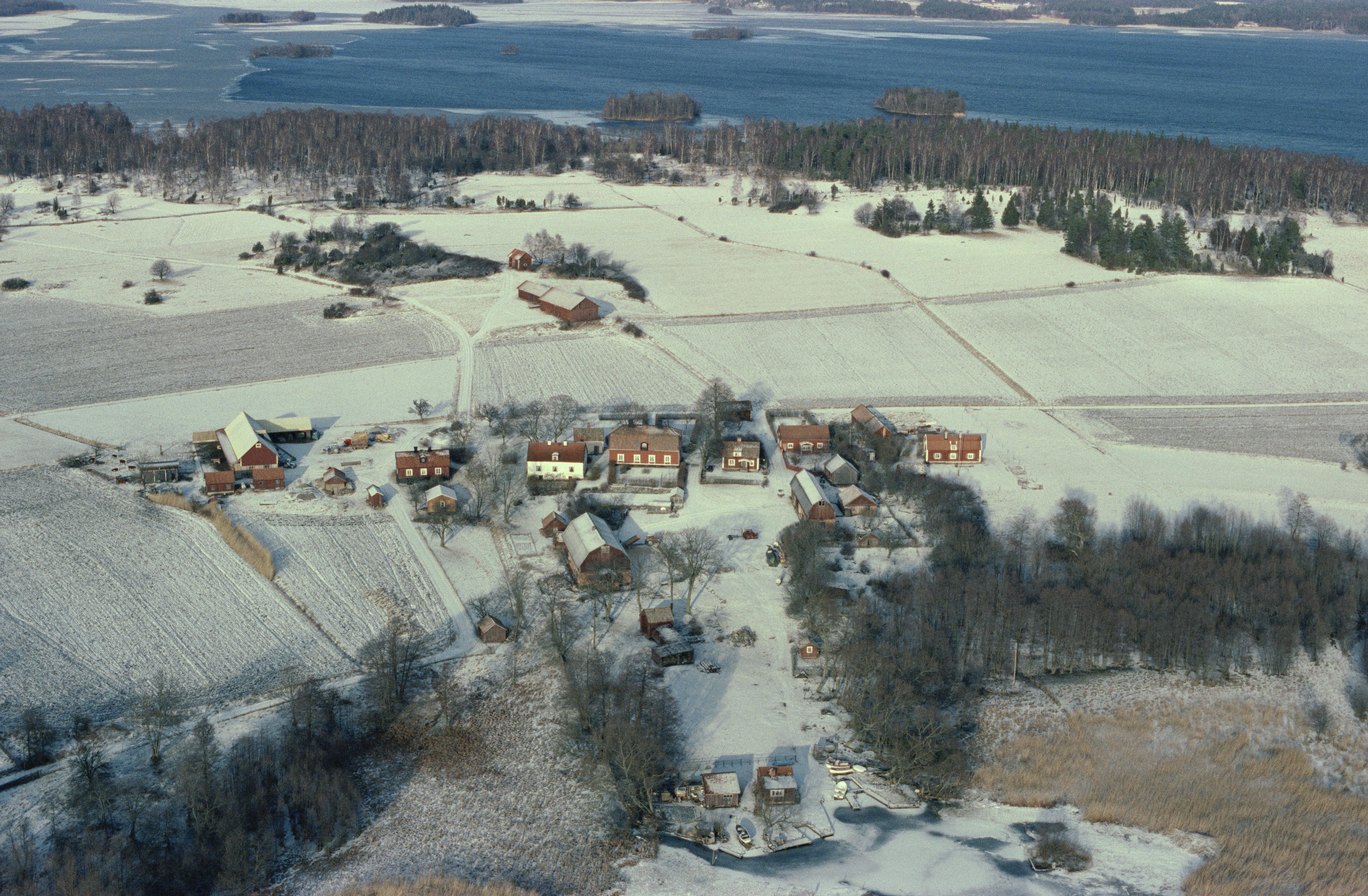 Beskrivning: Fornlämningsområdet Birka i norra delen på Björkö i Mälaren. Kassviken i bildens nedre del. Vid bildens mitt Björkö by och bytomt RAÄnr Adelsö 255:1 m.fl. Över bildens mitt bo- och gravplats Hemlanden och Svarta jorden RAÄnr Adelsö 118:1 vid Grindsbacka. Bilden är tagen mot (väderstreck): N