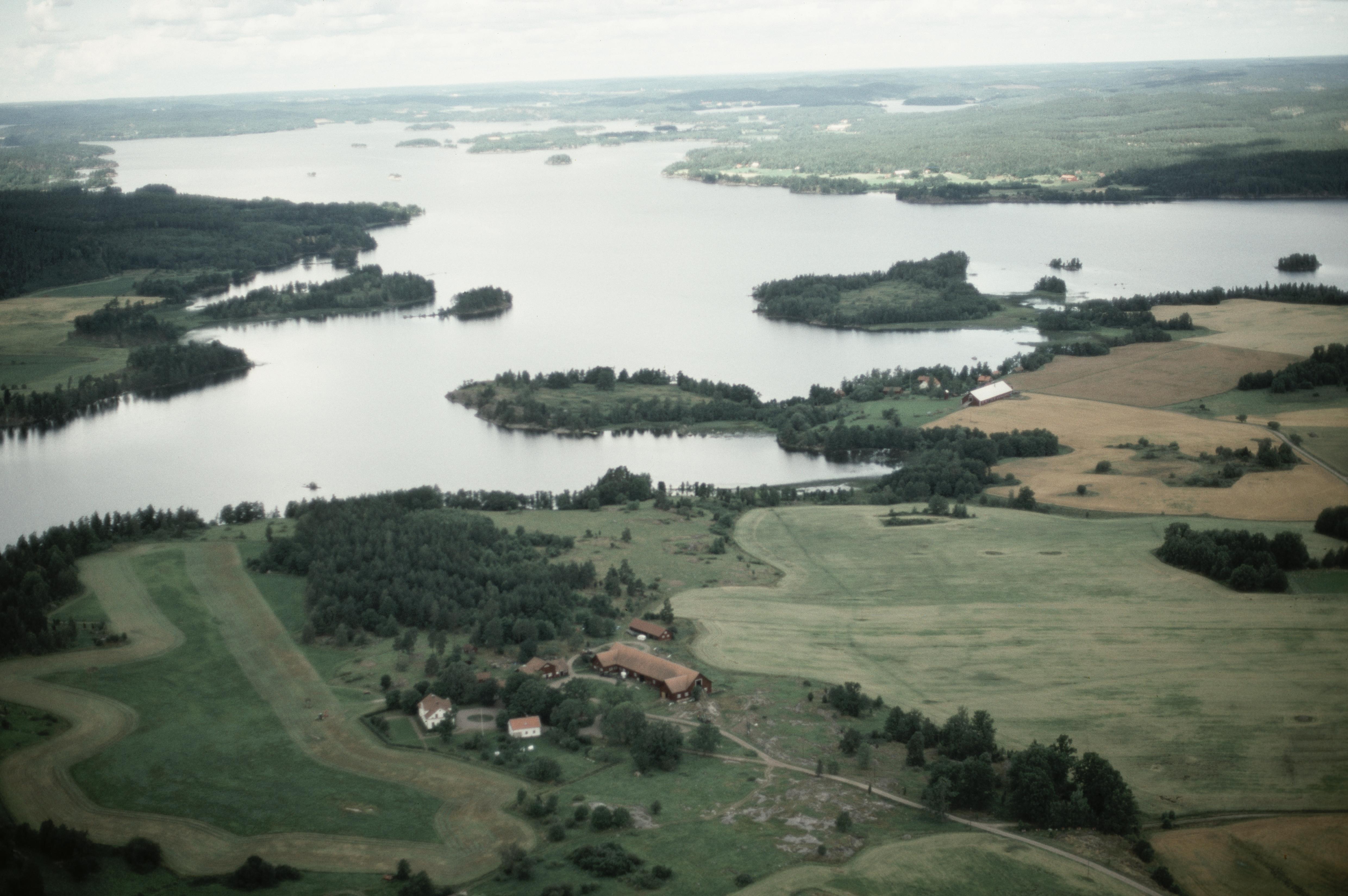Beskrivning: Hornsbergs herrgård vid sjön Åsunden. I bildens övre del Ekeby by med gravfält RAÄnr Horn 32:1. Bilden är tagen mot (väderstreck): NV