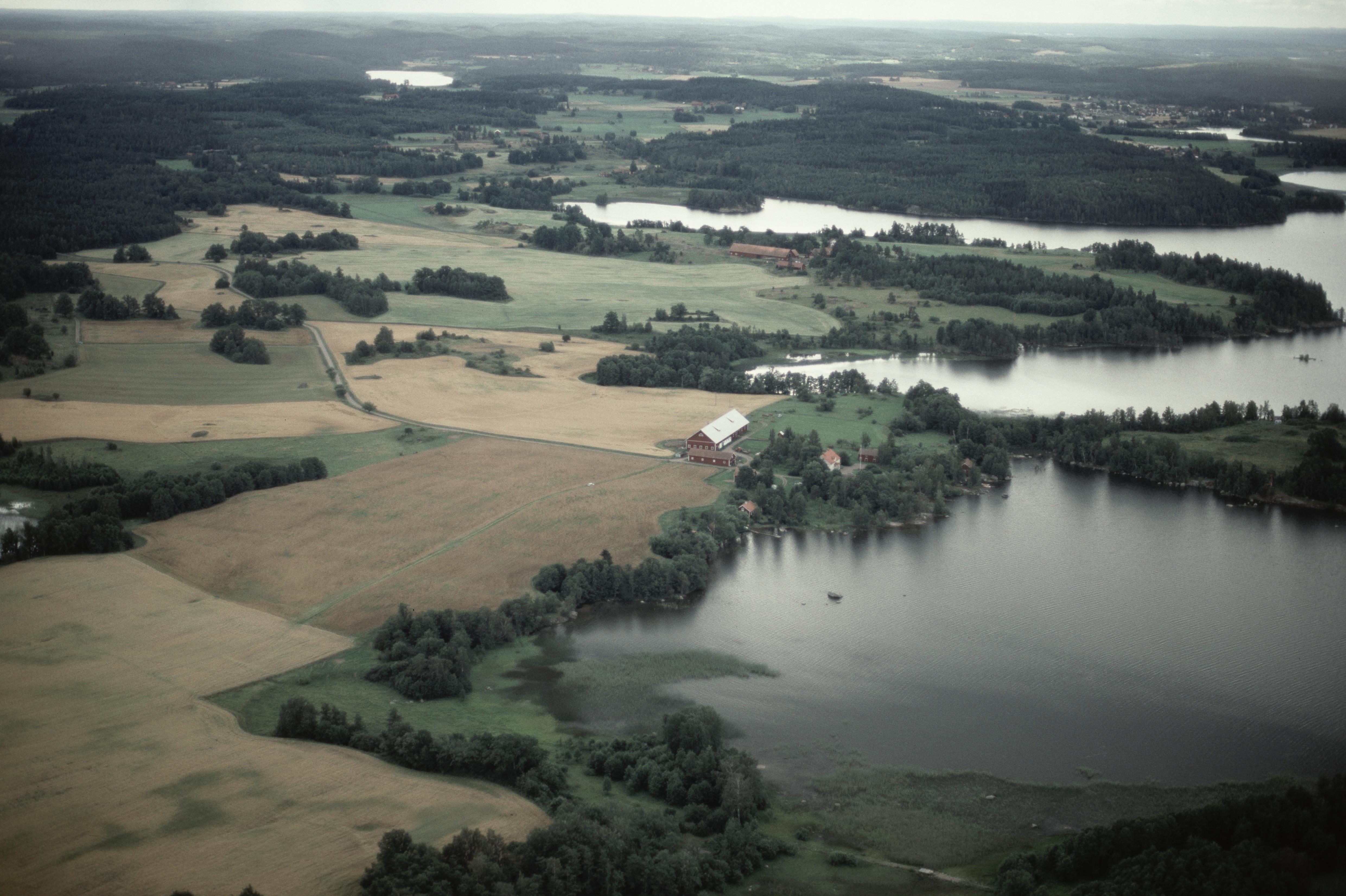Beskrivning: Hornsbergs herrgård och Ekeby by med gravfält RAÄnr Horn 32:1 vid sjön Åsunden. Bilden är tagen mot (väderstreck): S