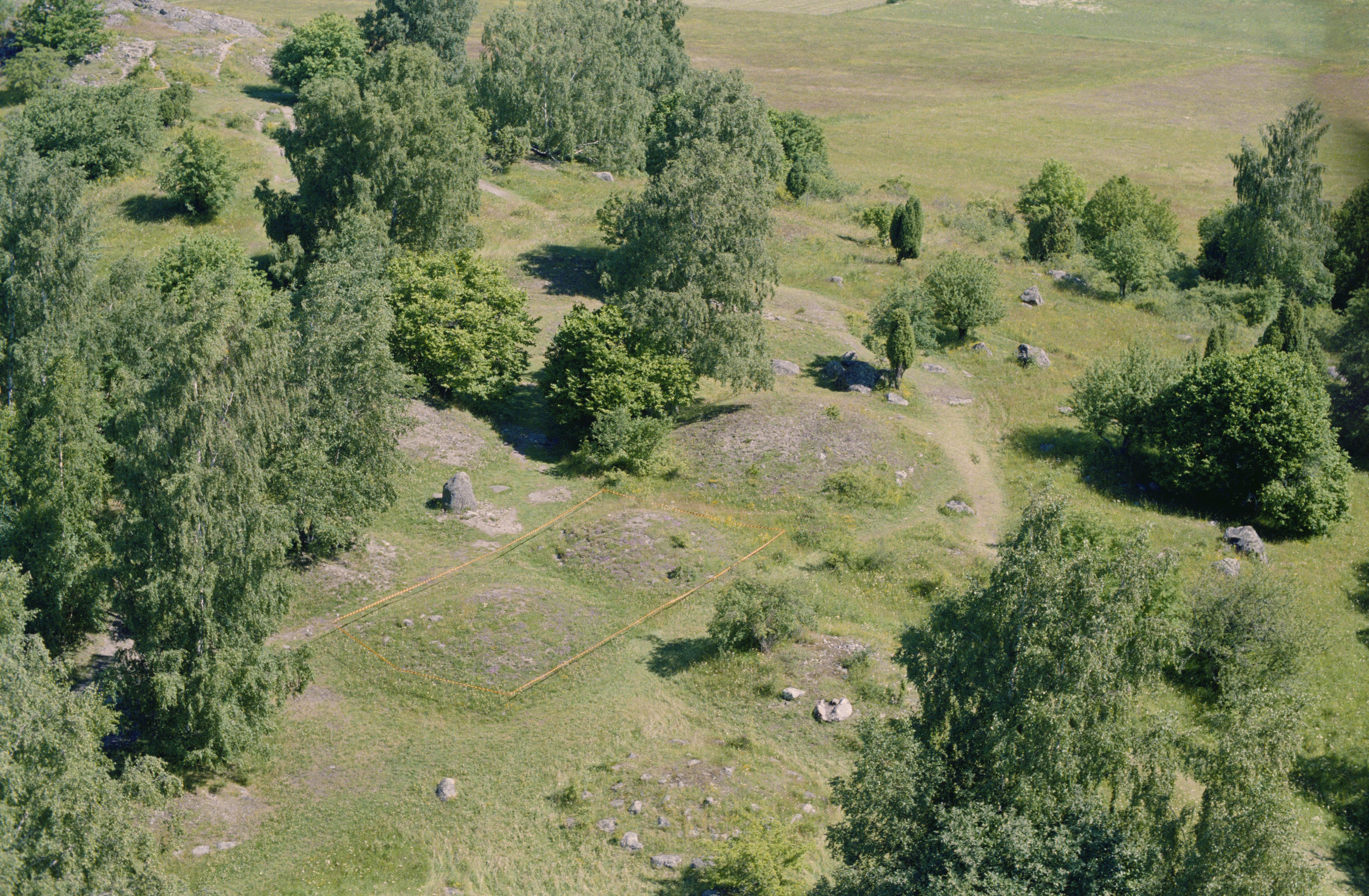 Beskrivning: Fornlämningsområdet Birka på Björkö i Mälaren. Fornborg Borg RAÄnr Adelsö 34:1 vid Ansgarsmonumentet och gravfält Borgs hage Adelsö 35:1. Bilden är tagen mot (väderstreck): NNO