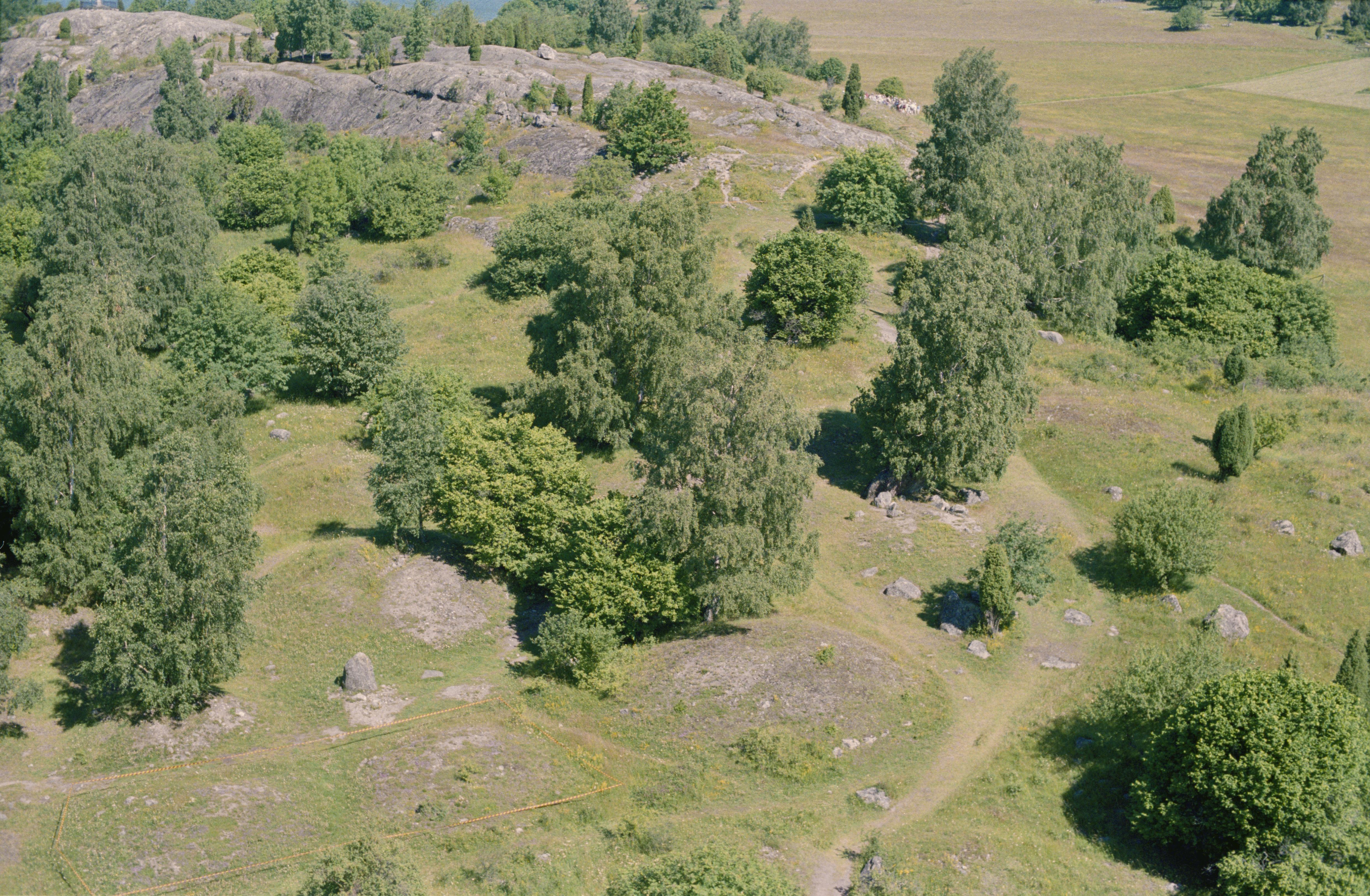 Beskrivning: Fornlämningsområdet Birka på Björkö i Mälaren. Fornborg Borg RAÄnr Adelsö 34:1 vid Ansgarsmonumentet och gravfält Borgs hage Adelsö 35:1. Bilden är tagen mot (väderstreck): NNO