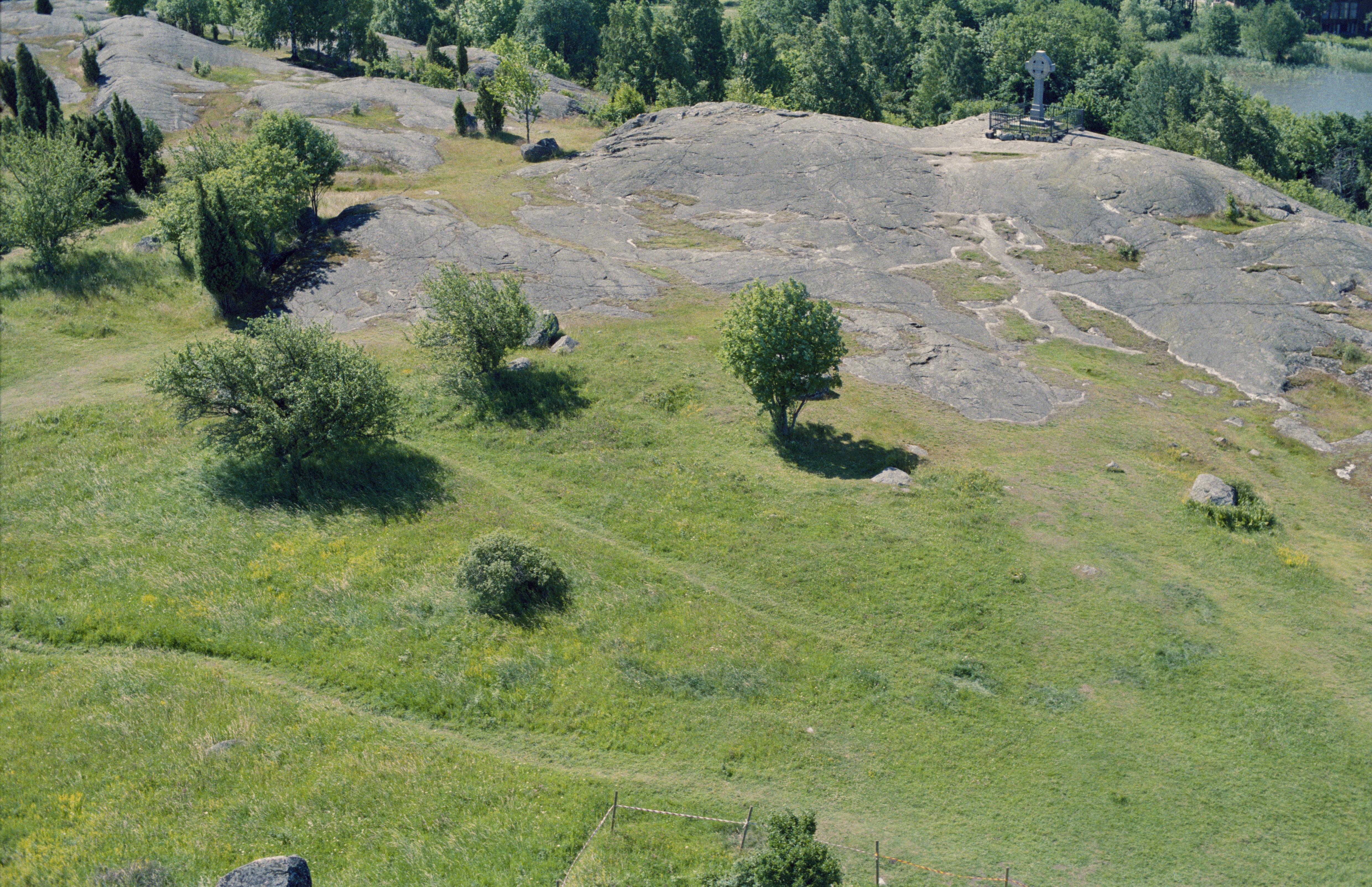 Beskrivning: Fornlämningsområdet Birka på Björkö i Mälaren. Fornborg Borg RAÄnr Adelsö 34:1 i området Garnisonen vid Ansgarsmonumentet och gravfält Borgs hage Adelsö 35:1. Bilden är tagen mot (väderstreck): SSV