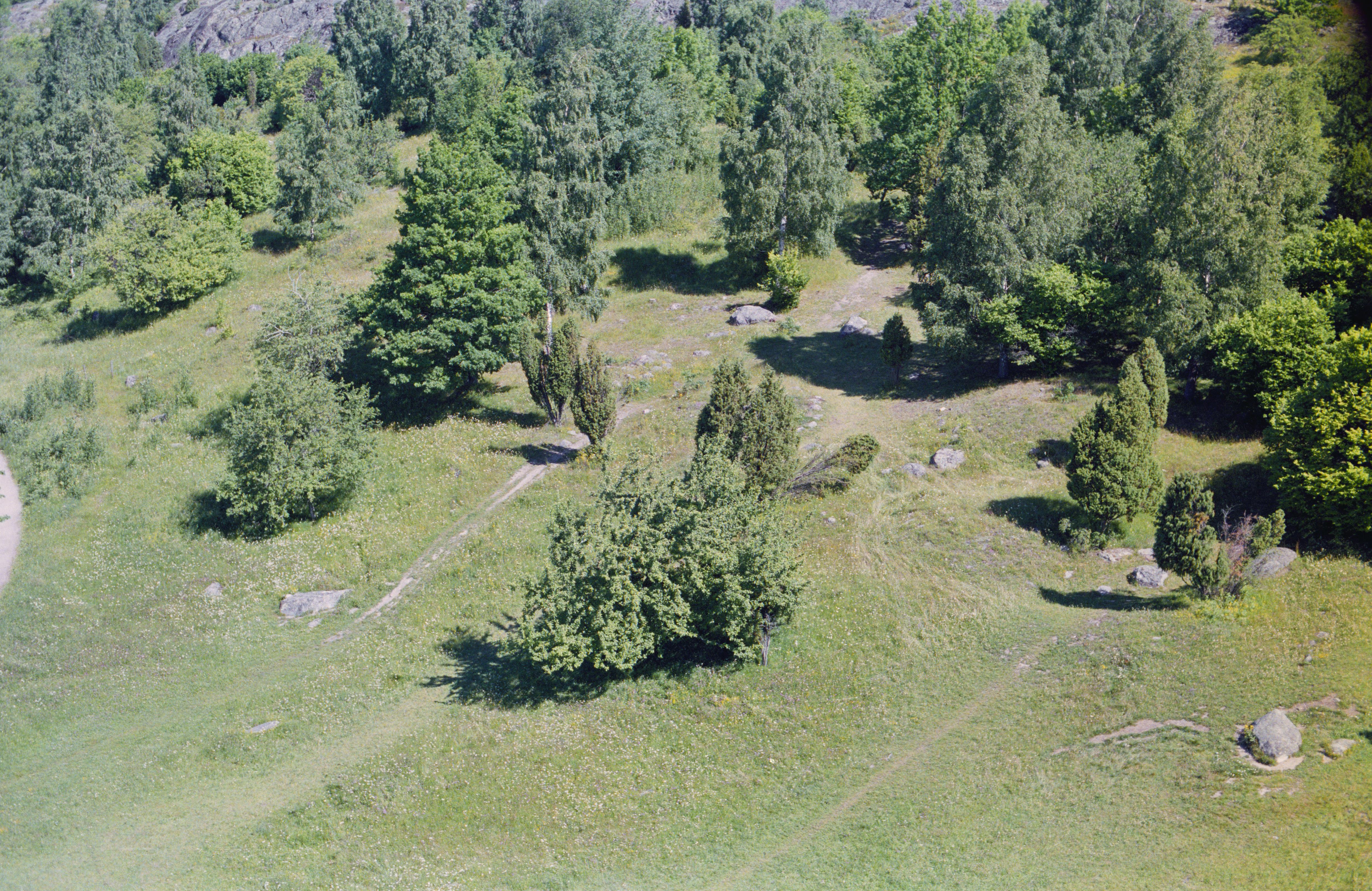 Beskrivning: Fornlämningsområdet Birka på Björkö i Mälaren. Stigar i gravältet Borgs hage RAÄnr Adelsö 35:1 vid fornborg Borg RAÄnr Adelsö 34:1. Bilden är tagen mot (väderstreck): NNV