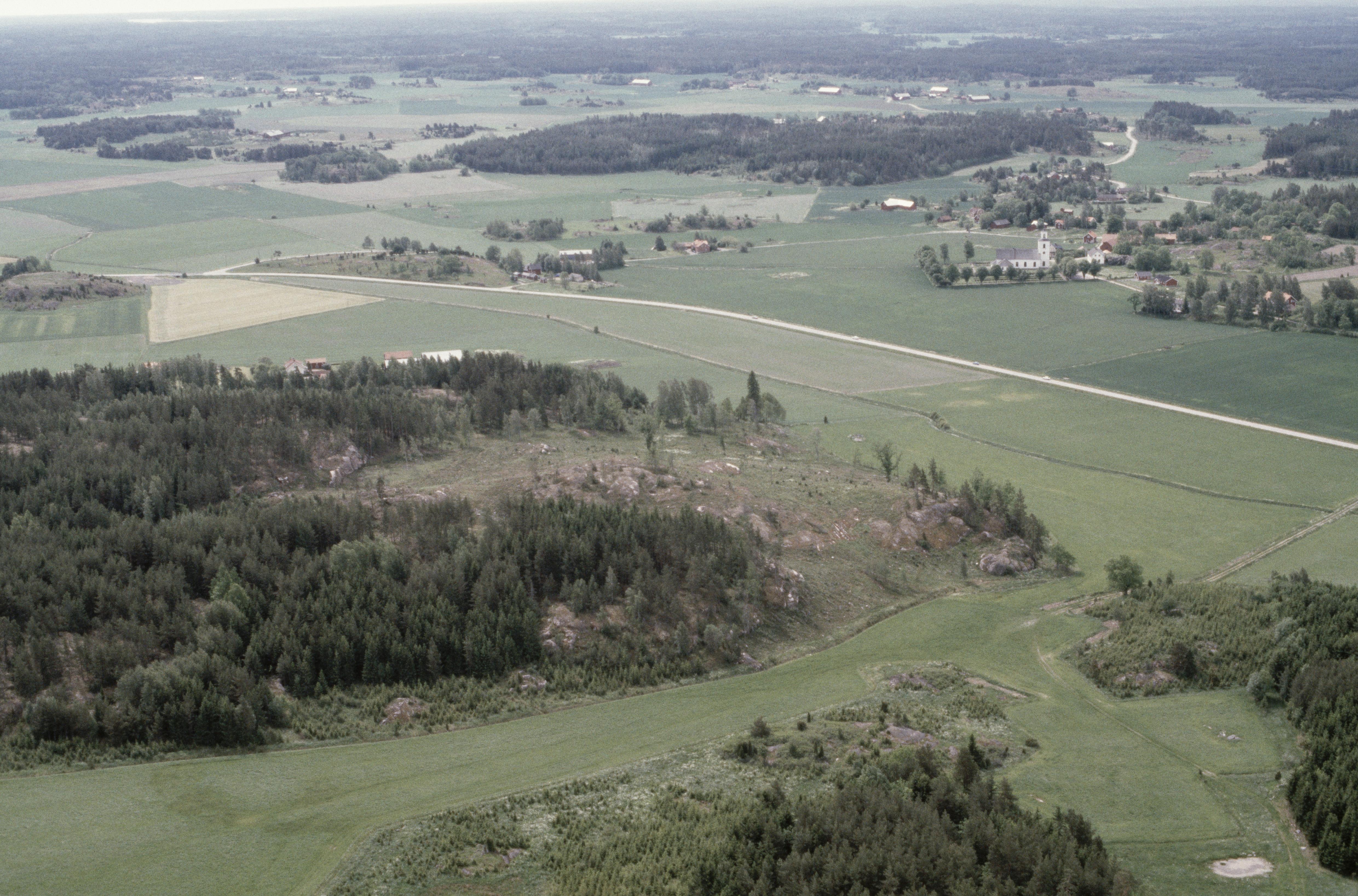 Beskrivning: Häradshammars kyrka uppe till höger. Fornlämningsområde vid Myrby. Boplats RAÄnr Häradshammar 443:1, stensättning och hägnad Häradshammar 277:1-2 m.fl. vid bildens mitt. Bilden är tagen mot (väderstreck): SV