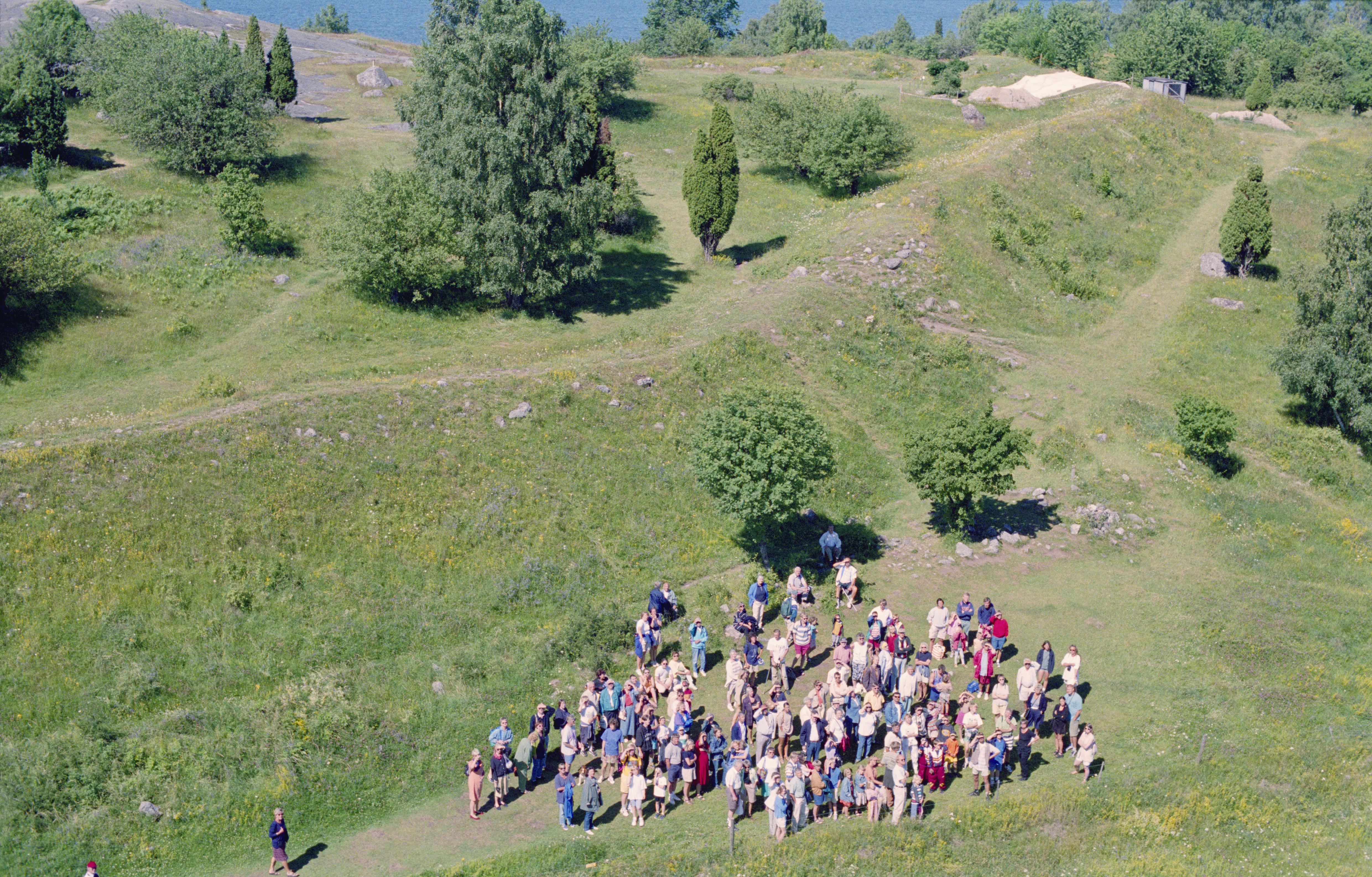 Beskrivning: Fornlämningsområdet Birka på Björkö i Mälaren. Besökare på stigar vid gravfält Borgs hage RAÄnr Adelsö 35:1 och Ansgarsmonumentet i fornborg Borg RAÄnr Adelsö 34:1. Uppe till höger arkeologisk undersökning i fornborgsvallen. Bilden är tagen mot (väderstreck): NV