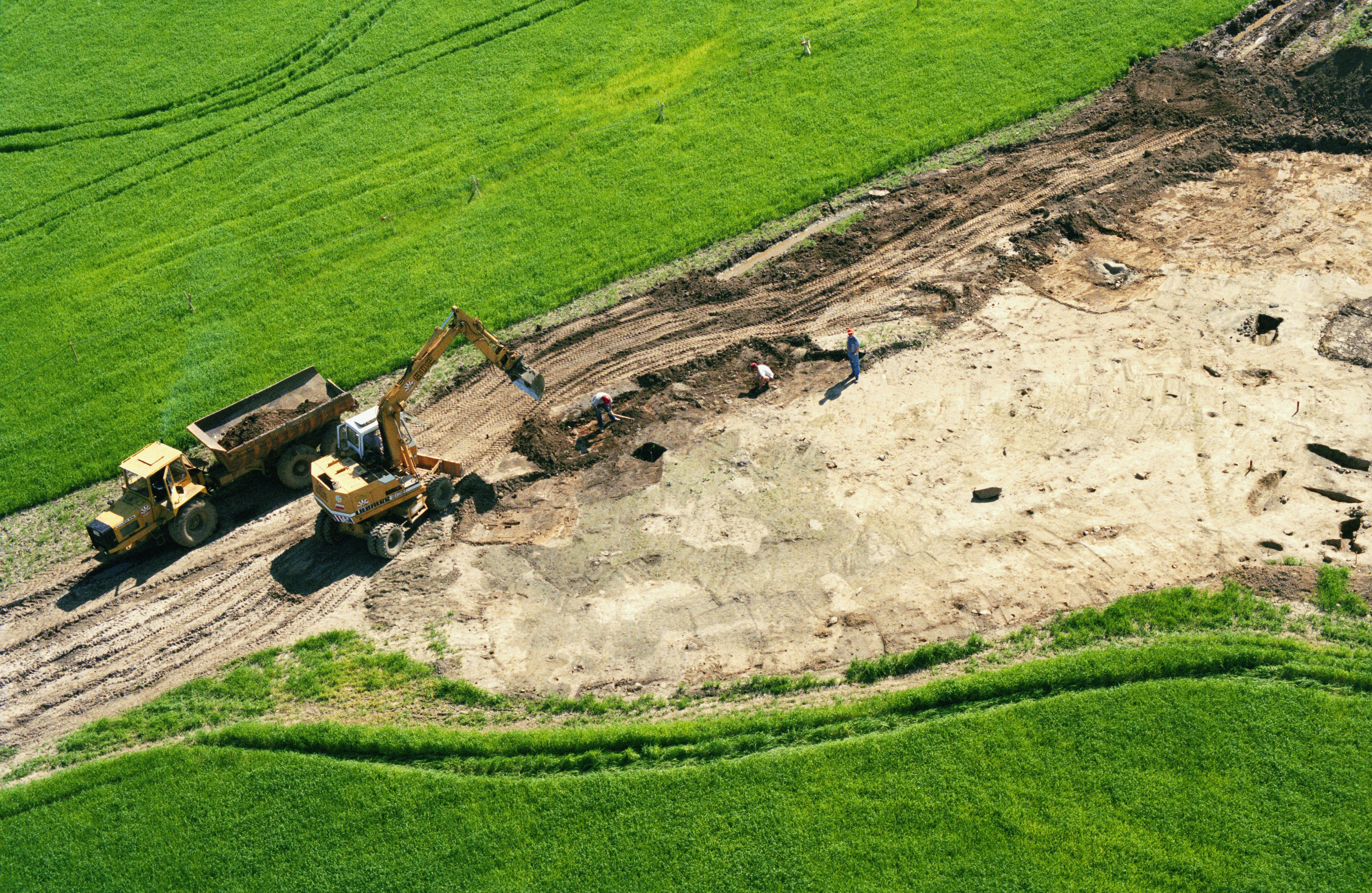 Beskrivning: Arkeologisk undersökning vid gränsen mellan socknen Högby och Mjölby innan bygging av ny väg. Boplats RAÄnr Högby 89:1 m.fl. Bilden är tagen mot (väderstreck): SV