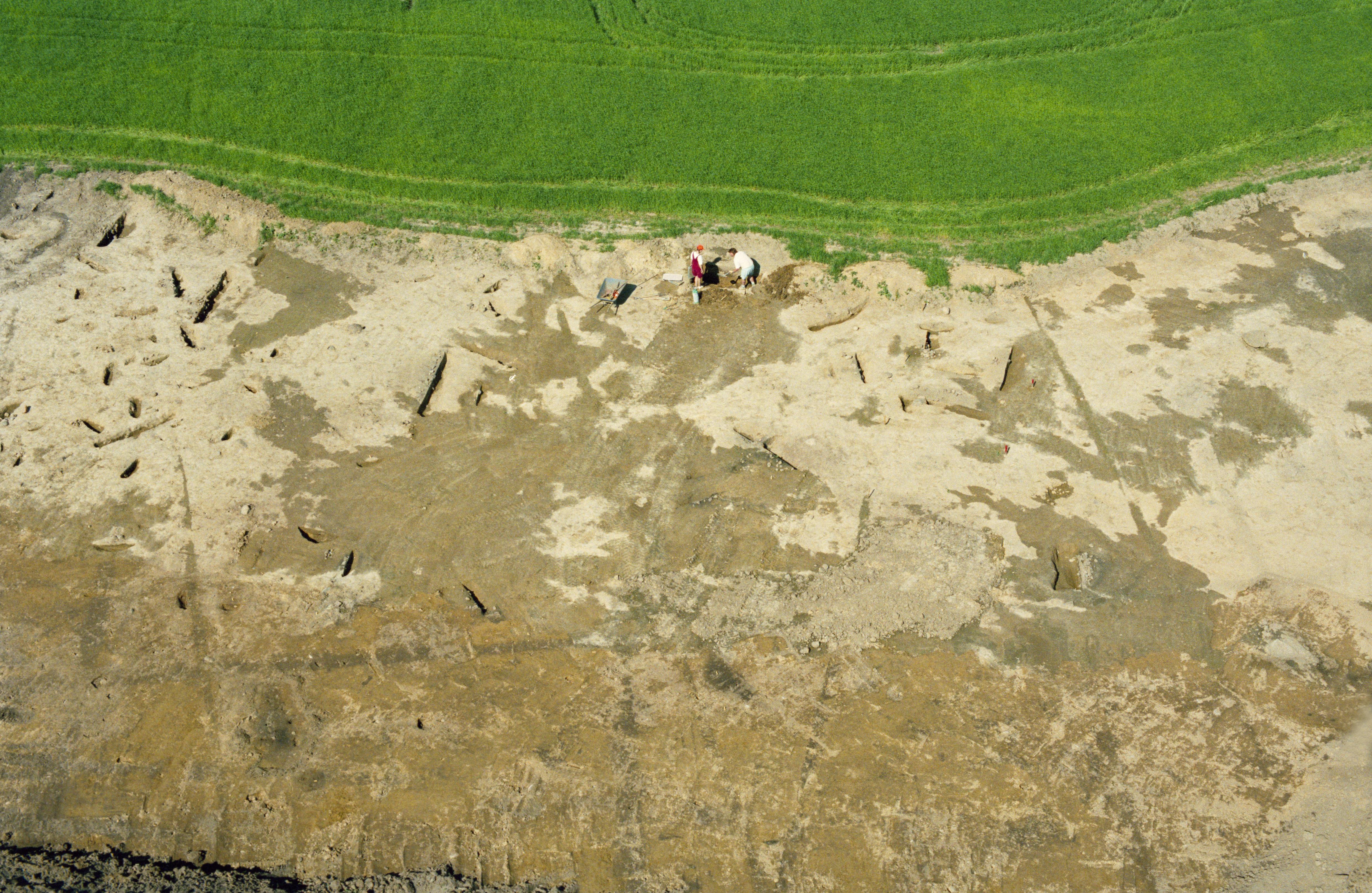 Beskrivning: Arkeologisk undersökning vid gränsen mellan socknen Högby och Mjölby innan bygging av ny väg. Boplats RAÄnr Högby 89:1 m.fl. Bilden är tagen mot (väderstreck): Ö